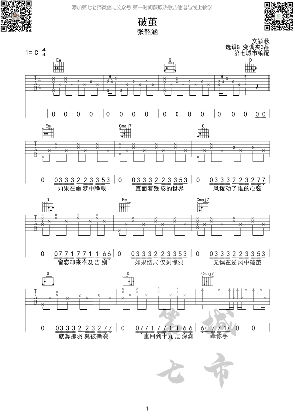 曲谱介绍: 张韶涵《破茧》吉他弹唱谱,采用C调指法编配,第七城市编配出品,共有2张高清图谱,免翻页排版设计。