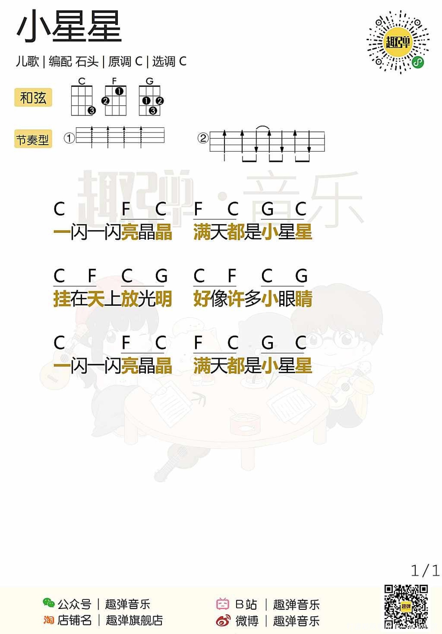 曲谱介绍: 儿歌《小星星》尤克里里谱,共有1张高清图谱,免翻页排版设计。