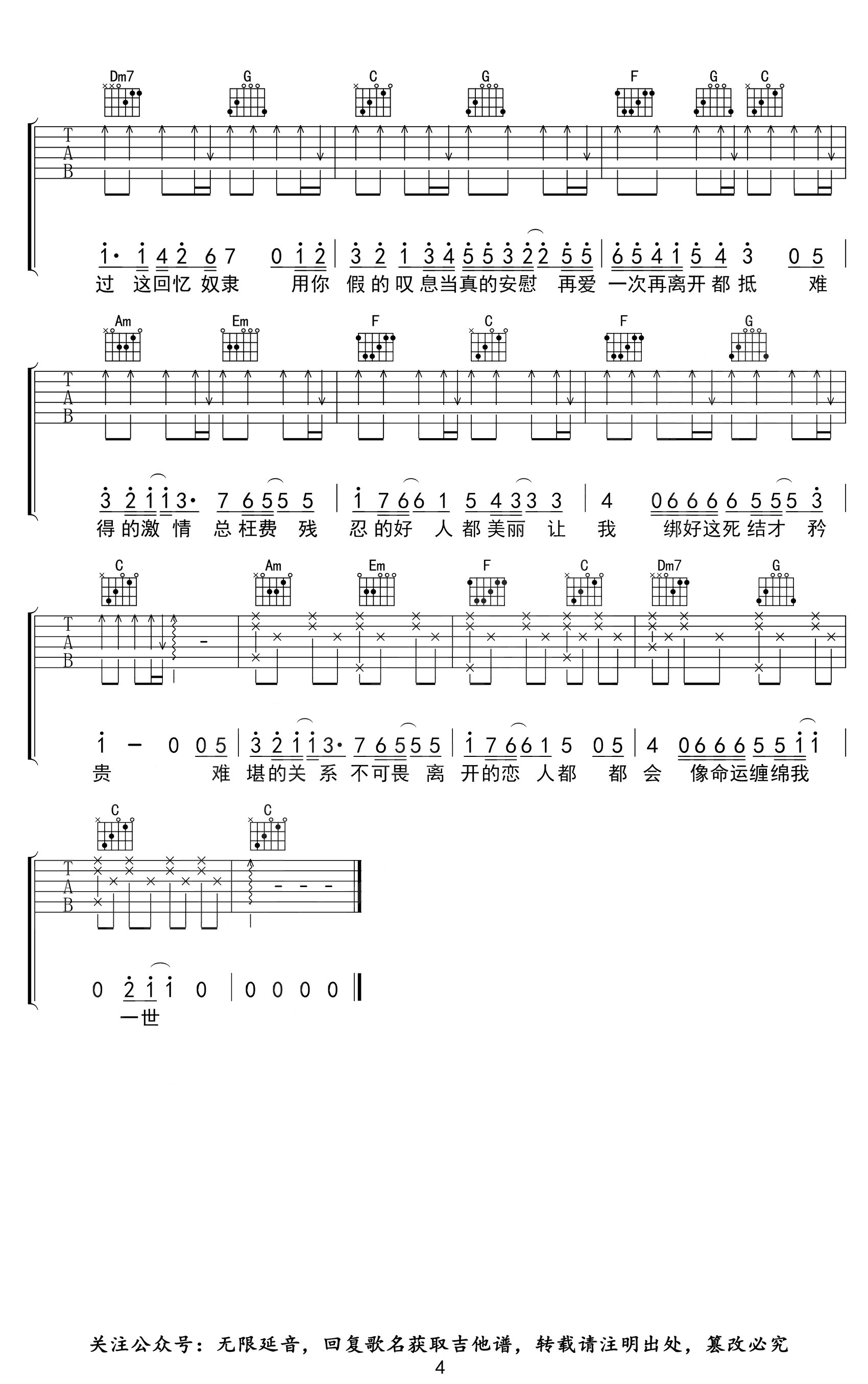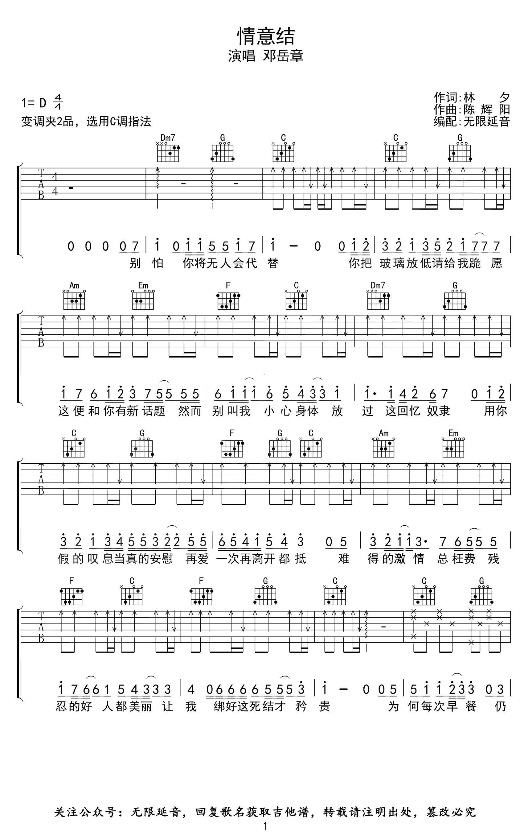 曲谱介绍: 《情意结》吉他弹唱谱,原调D选用C调指法,变调夹夹二品,完整编配共四张高清图片谱。