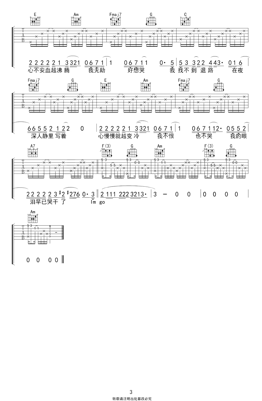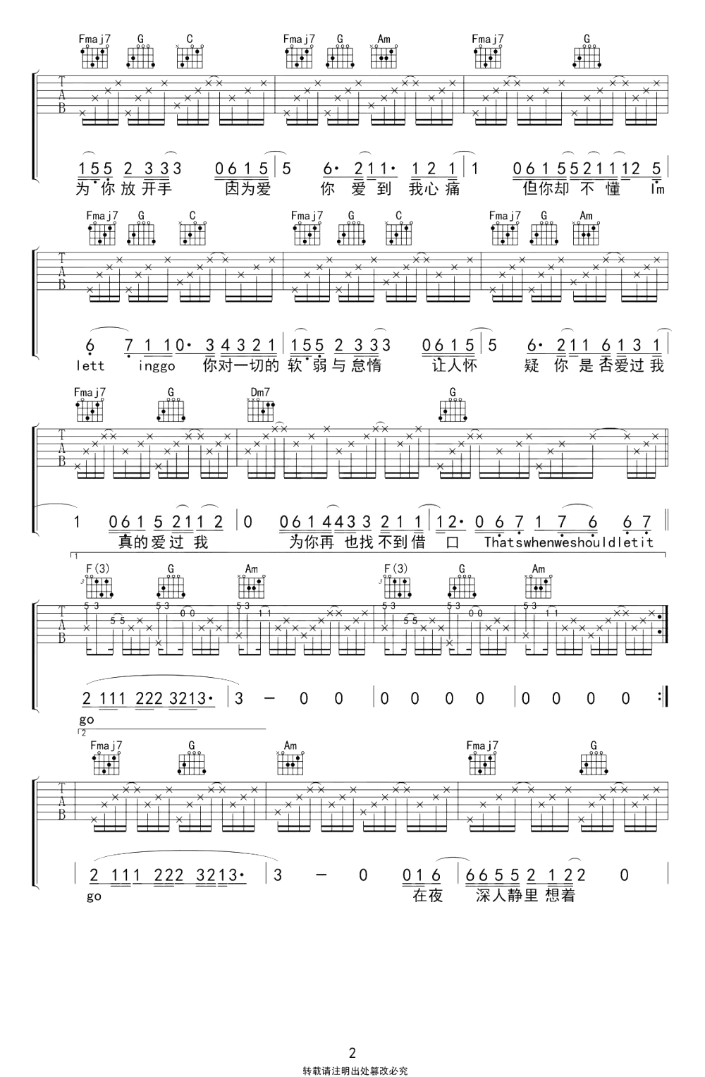 曲谱介绍: 《letting go》吉他弹唱谱,原调D,变调夹夹二品,选用C调指法,三张图片六线谱。