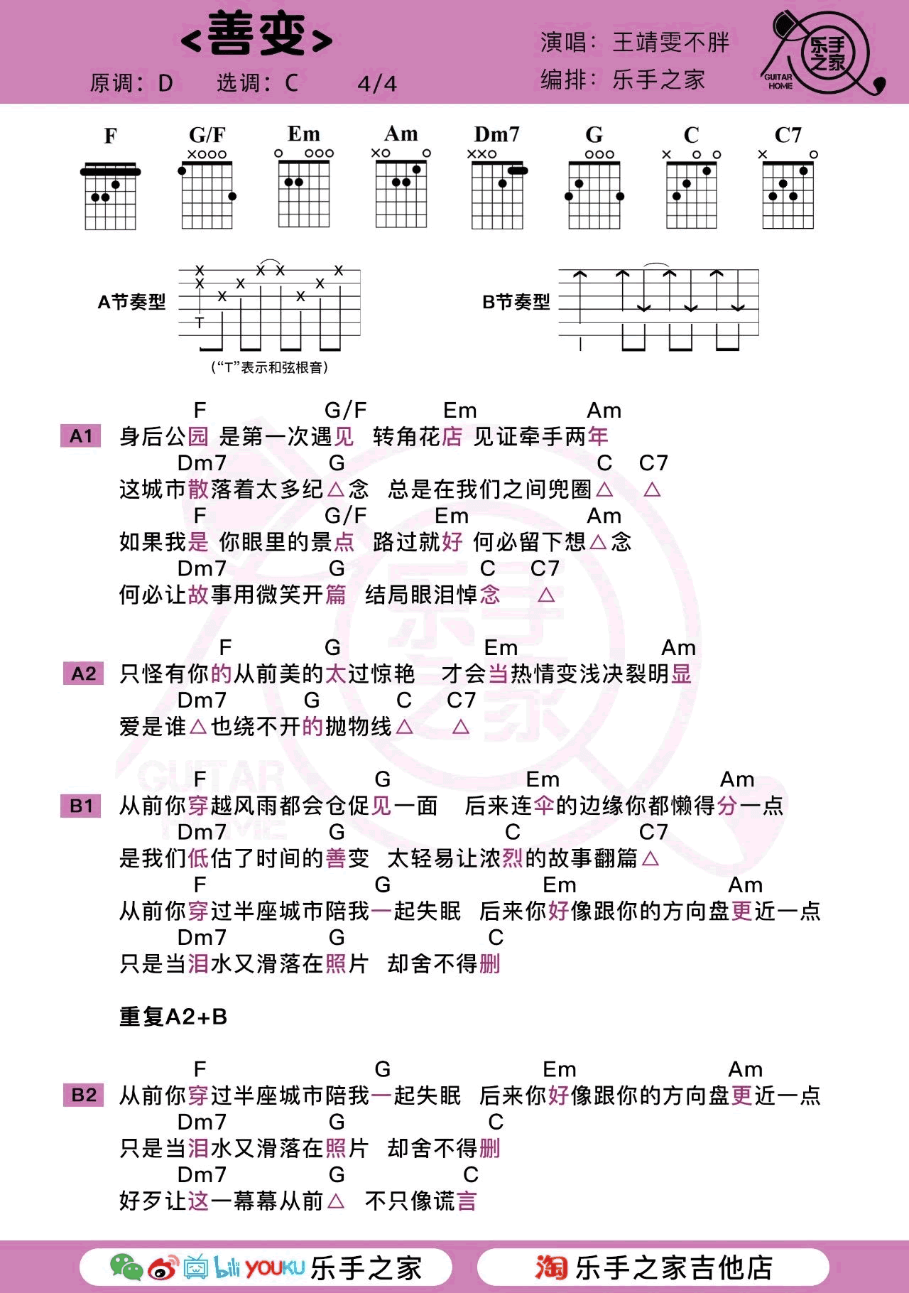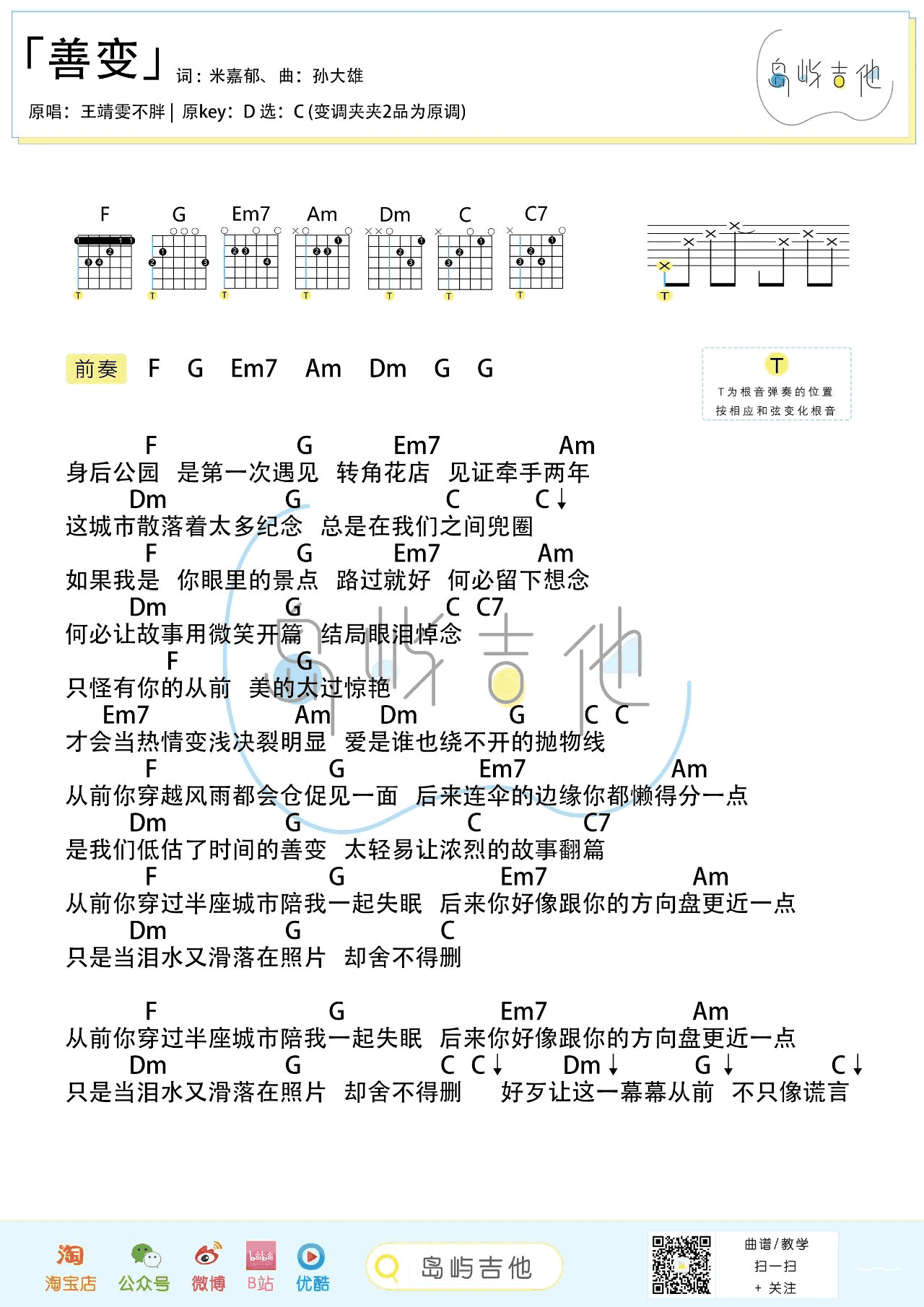 曲谱介绍: 《善变》吉他谱,王靖雯不胖演唱,一首伤感情歌,善变吉他弹唱谱,和弦图片谱,原调D选调C,变调夹二品为原调音高。岛屿吉他和乐手之家制谱分享。