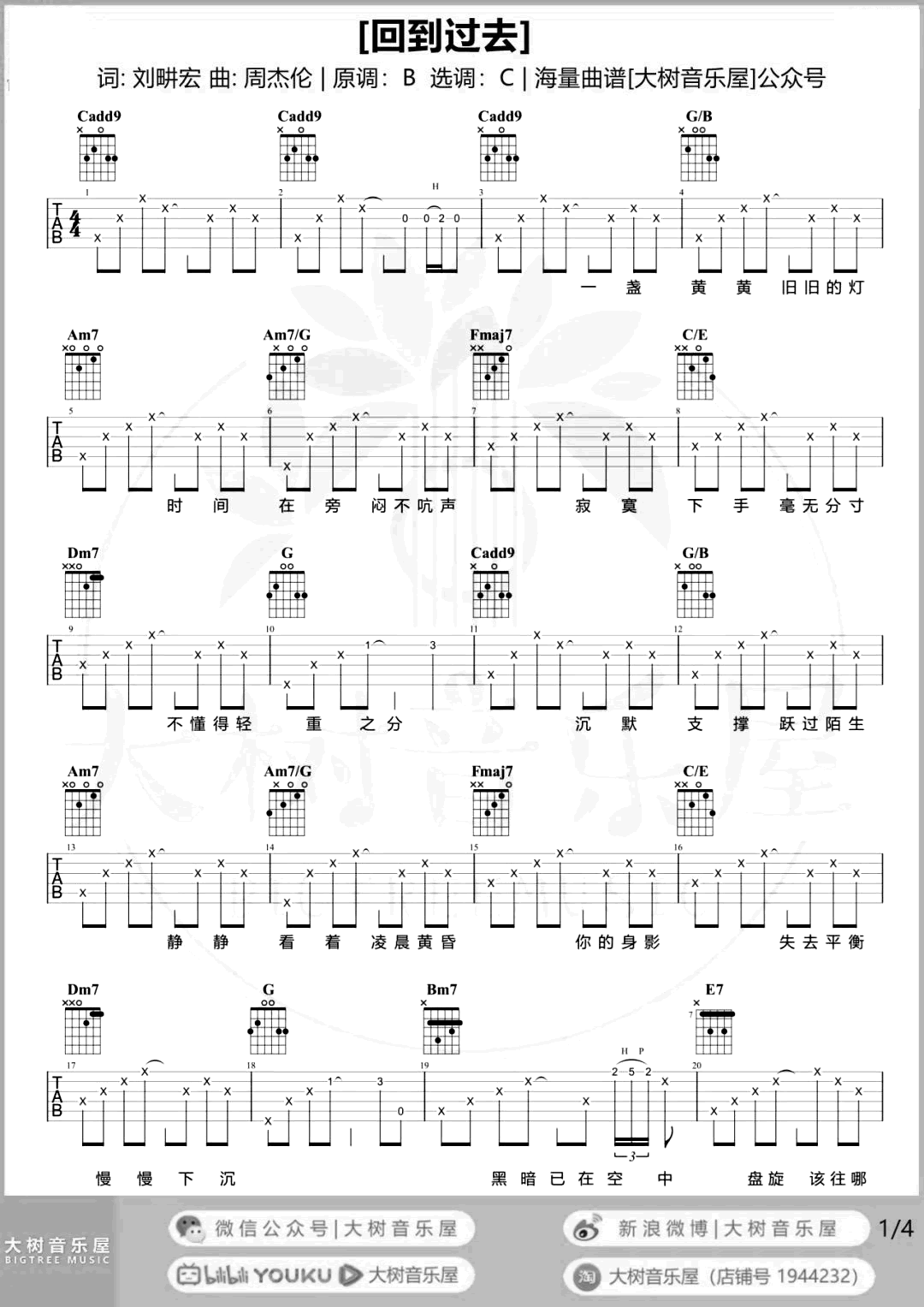 曲谱介绍: 周杰伦《回到过去》吉他弹唱谱,采用C调指法编配,共有5张高清图谱。