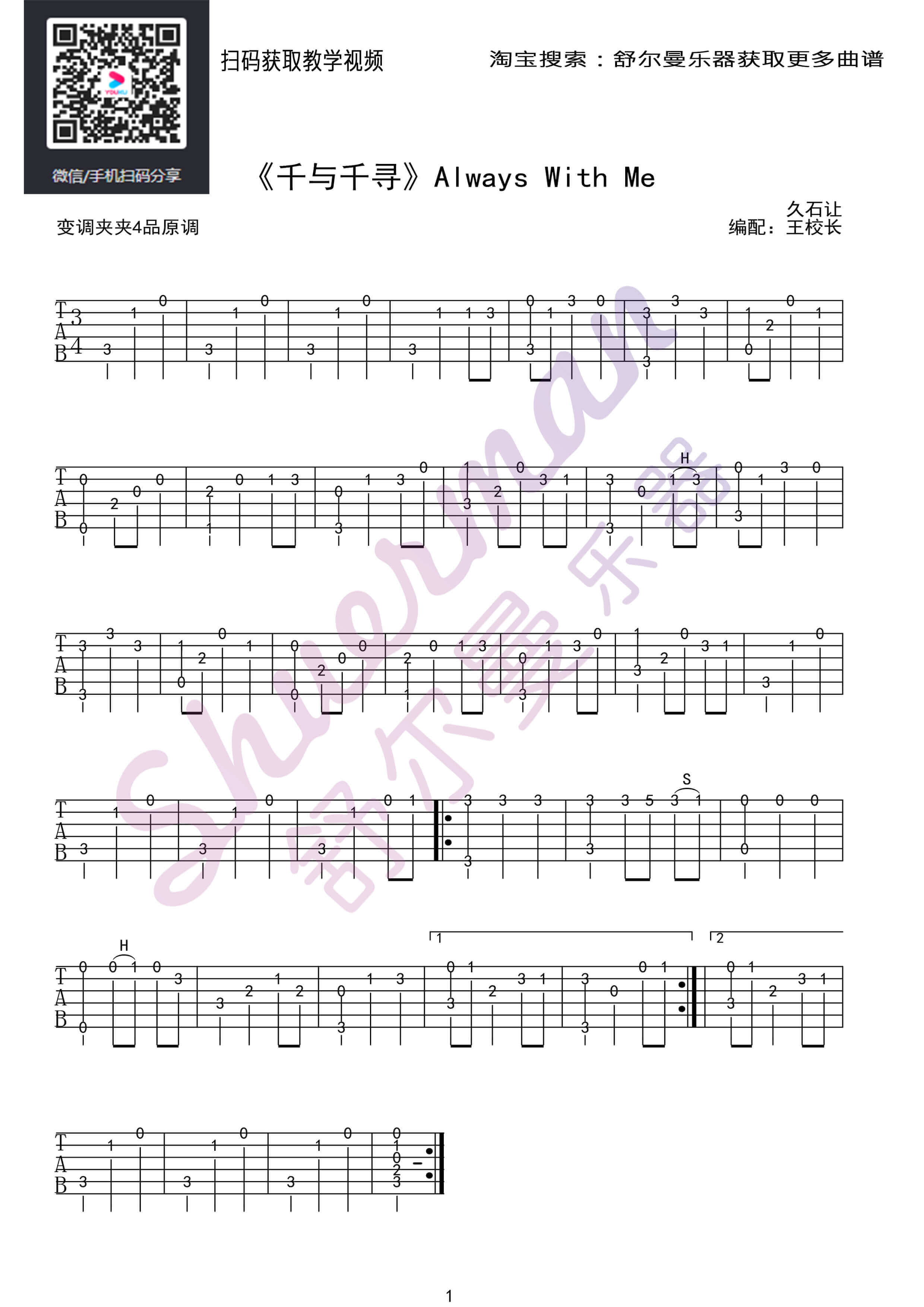 曲谱介绍: 《千与千寻》这部动漫想必大家都不陌生,很多人从这部电影里看到了很多东西,有关于诱惑、友情、亲情等等。 今天给大家推荐的就是这部电影的片尾曲《Always with me》,听这首歌仿佛又把我们代入了那个奇特的世界! 吉他弹唱演示及视频教学 来自网友舒尔曼乐器编配吉他谱,附指弹视频教学,本首曲子为43拍,练习时要注意,强弱弱强弱弱的律动感。