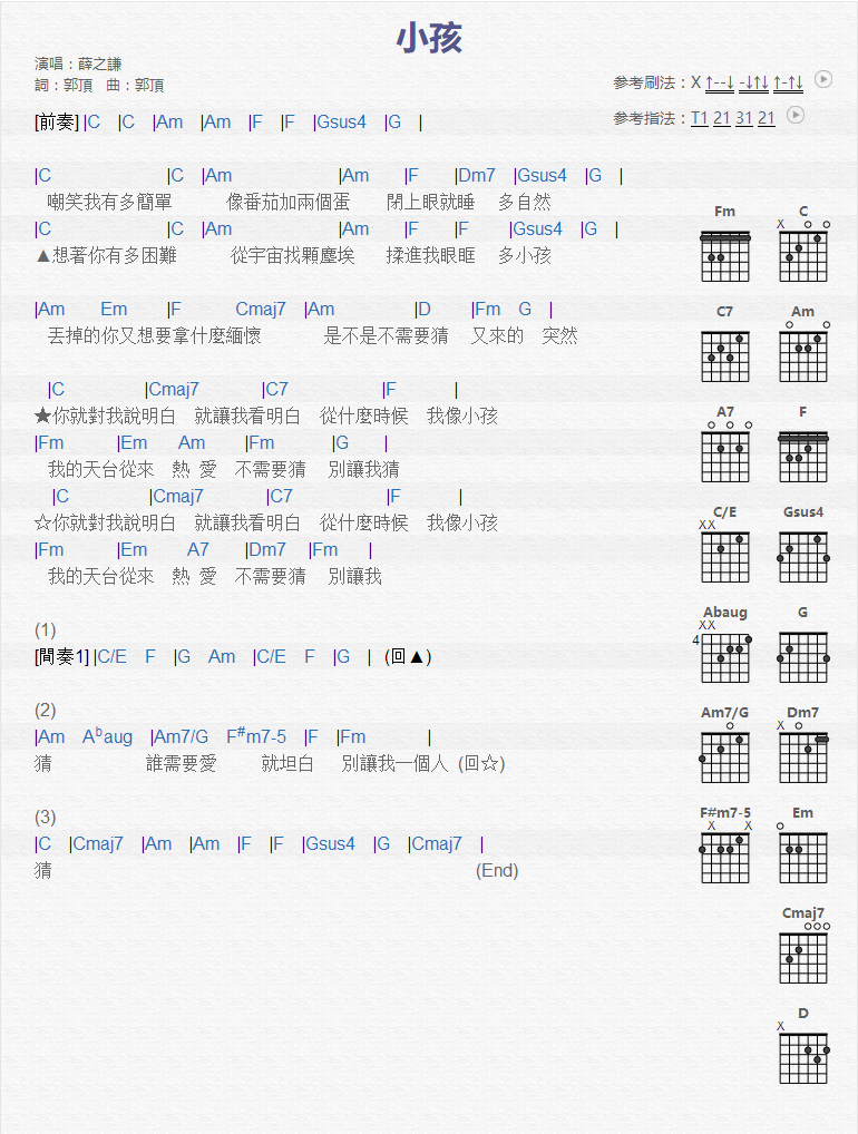 曲谱介绍: 小孩《小孩_》吉他弹唱谱,共有1张高清图谱,免翻页排版设计。