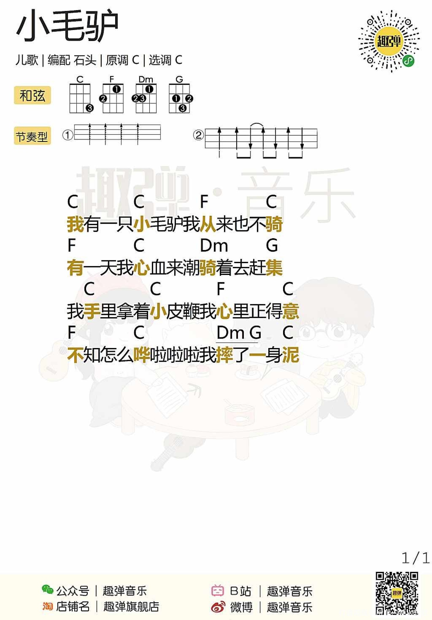 曲谱介绍: 儿歌《小毛驴》尤克里里谱,共有1张高清图谱,免翻页排版设计。