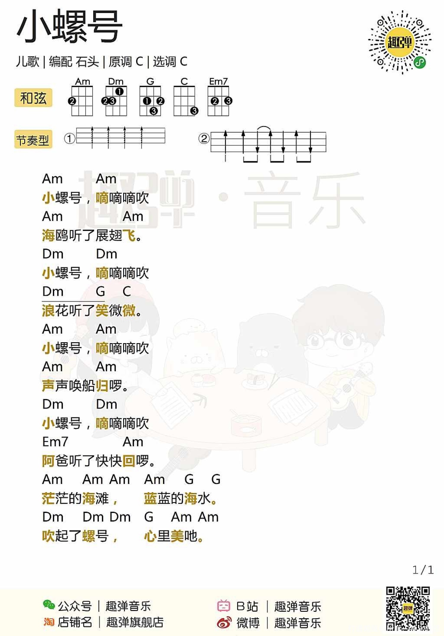 曲谱介绍: 儿歌《小螺号》尤克里里谱,共有1张高清图谱,免翻页排版设计。