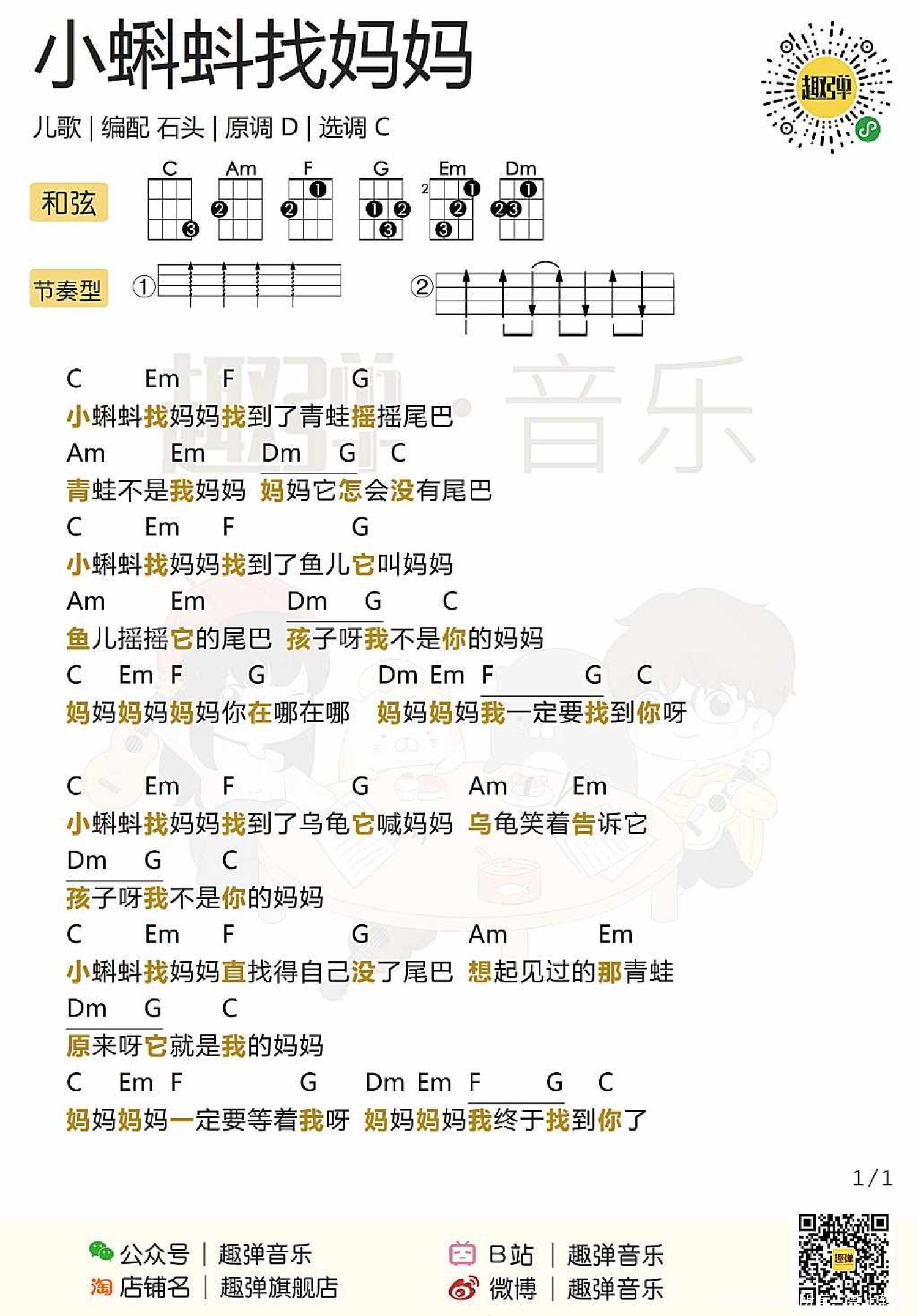 曲谱介绍: 儿歌《小蝌蚪找妈妈》尤克里里谱,共有1张高清图谱,免翻页排版设计。