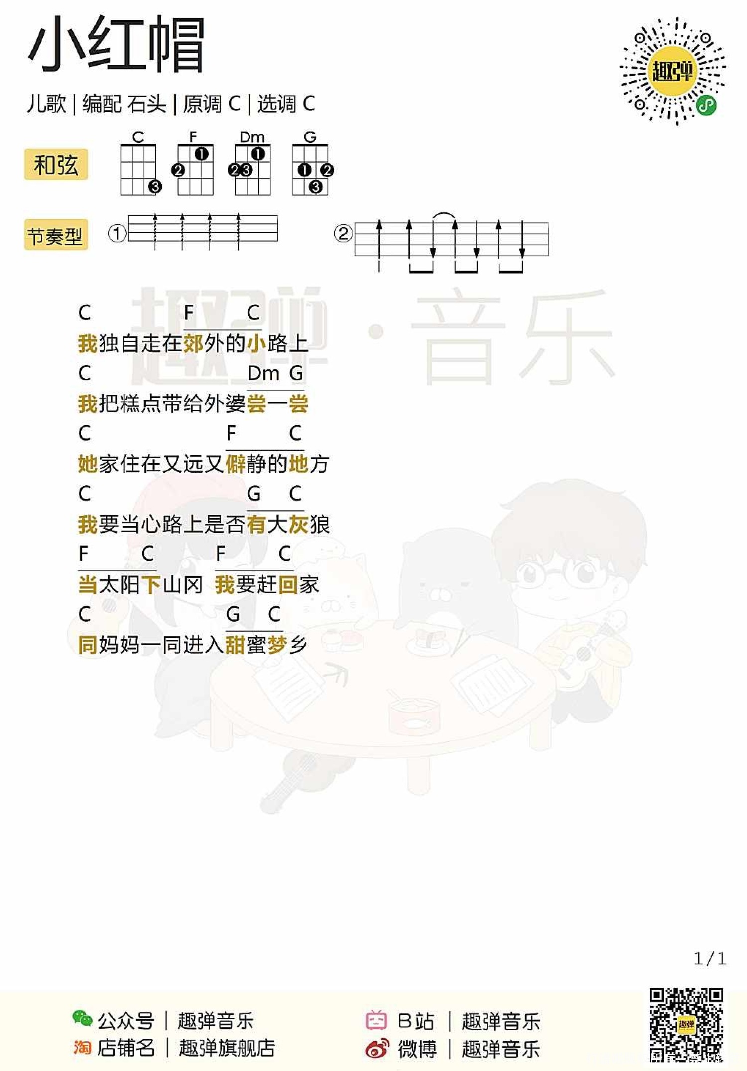 曲谱介绍: 儿歌《小红帽》尤克里里谱,共有1张高清图谱,免翻页排版设计。