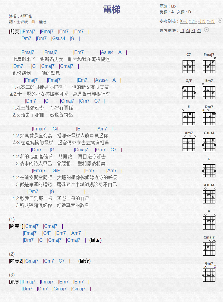 曲谱介绍: 电梯《电梯_》吉他弹唱谱,共有1张高清图谱,免翻页排版设计。