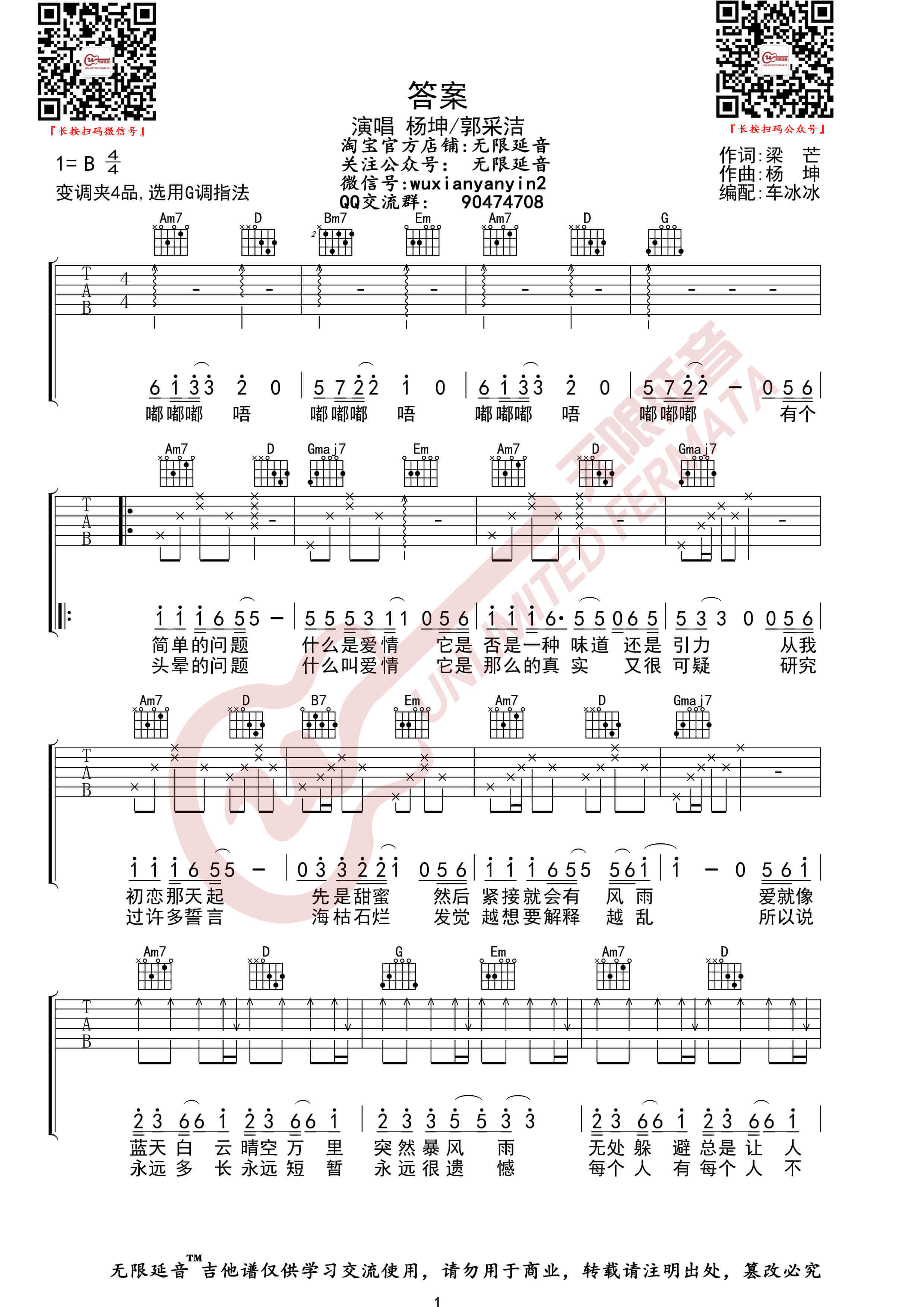 答案吉他谱 - 杨坤/郭采洁 - 吉他弹唱谱