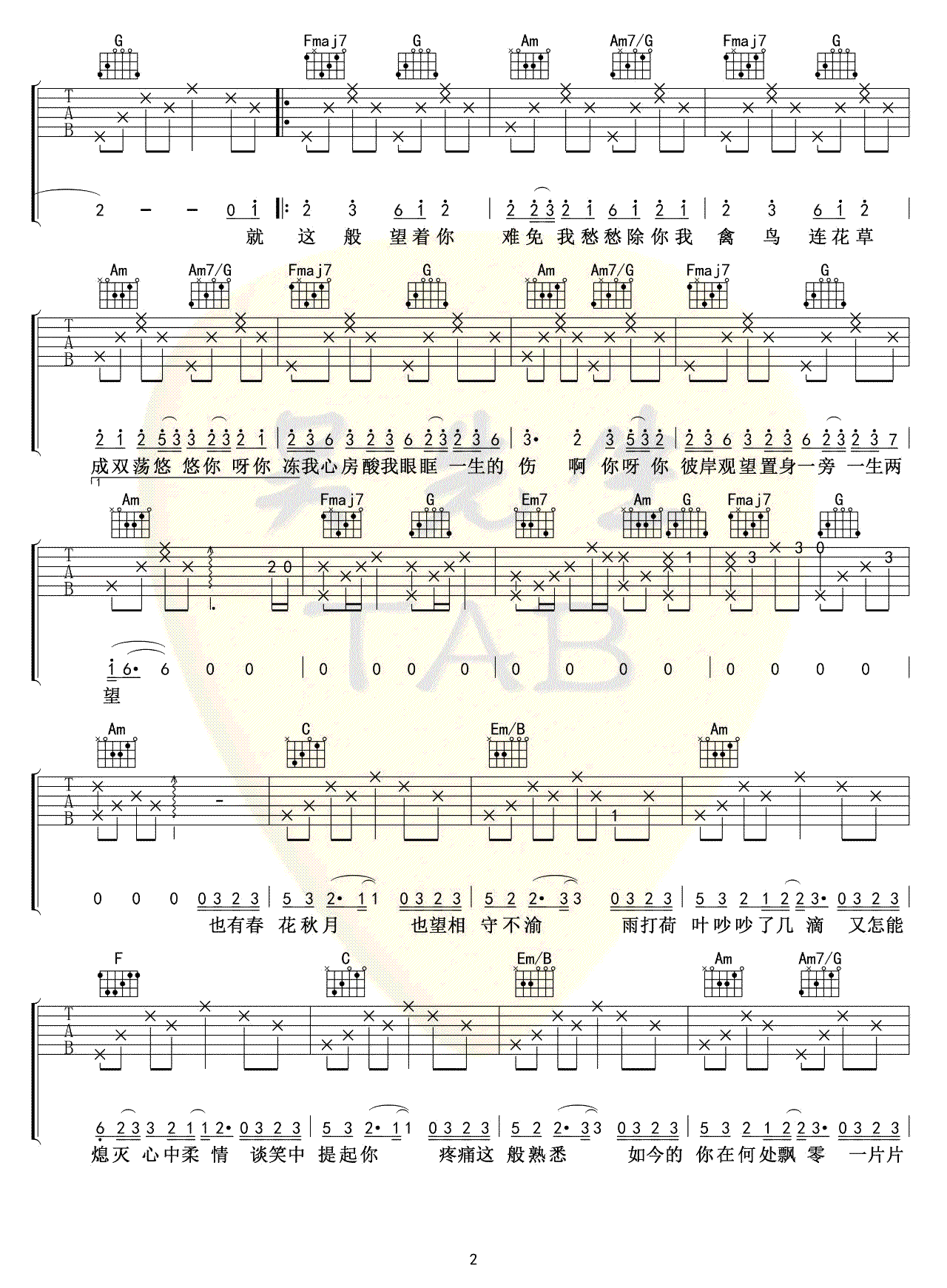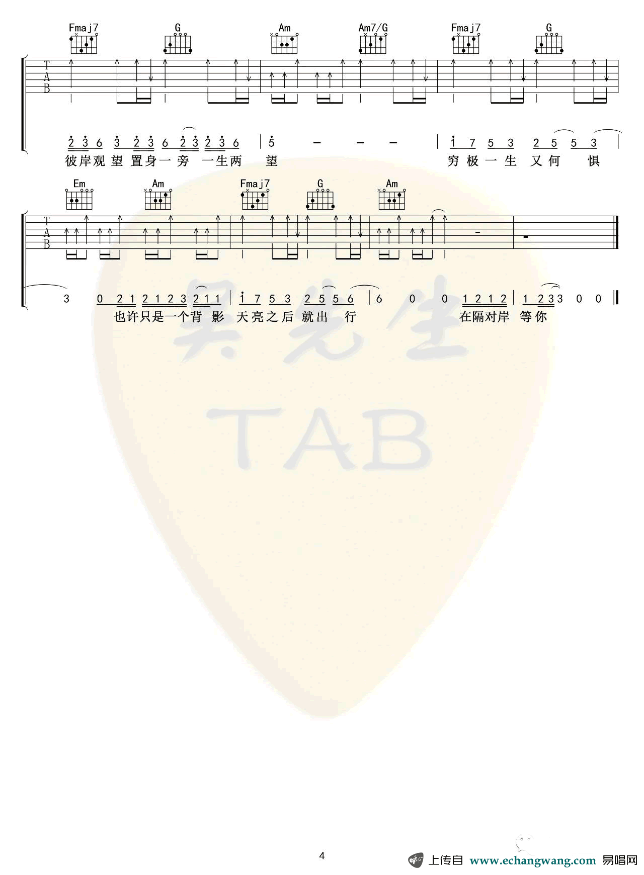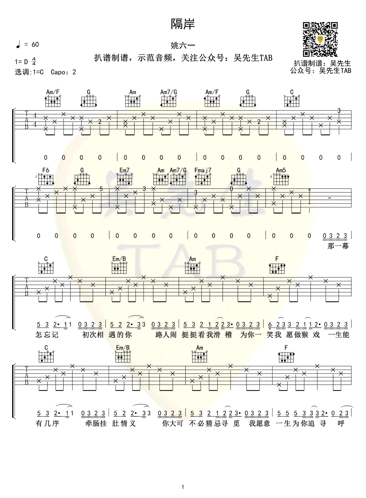 曲谱介绍: 姚六一《隔岸》吉他谱,原调D选调C,CAPO夹二品。一首古风歌曲,隔岸吉他弹唱谱,完整编配共四张图片六线谱 人生能有多少次邂逅?走马观花,抑或惊鸿一瞥,举手抬足间牵扯出纠缠的曲线。那一幕相遇的怦然心动,不禁地牵肠挂肚。谈笑风声中,多少往昔掺杂着琐碎的点滴,挥不去的是你点点柔情。 此去经年,也有春华秋月,也有相守不渝。穷极一生,奈何冷暖如流,奈何情深缘浅。为何禽鸟花草都成双入对,而你我竟隔岸观望?缘来缘去,这生生横亘的鸿沟,你却置身事外,一生两望。也许只是在期待一个背影,一个心之所属的希望。天亮以后整装待发,而你又会在哪里,是不是也在对岸等我?