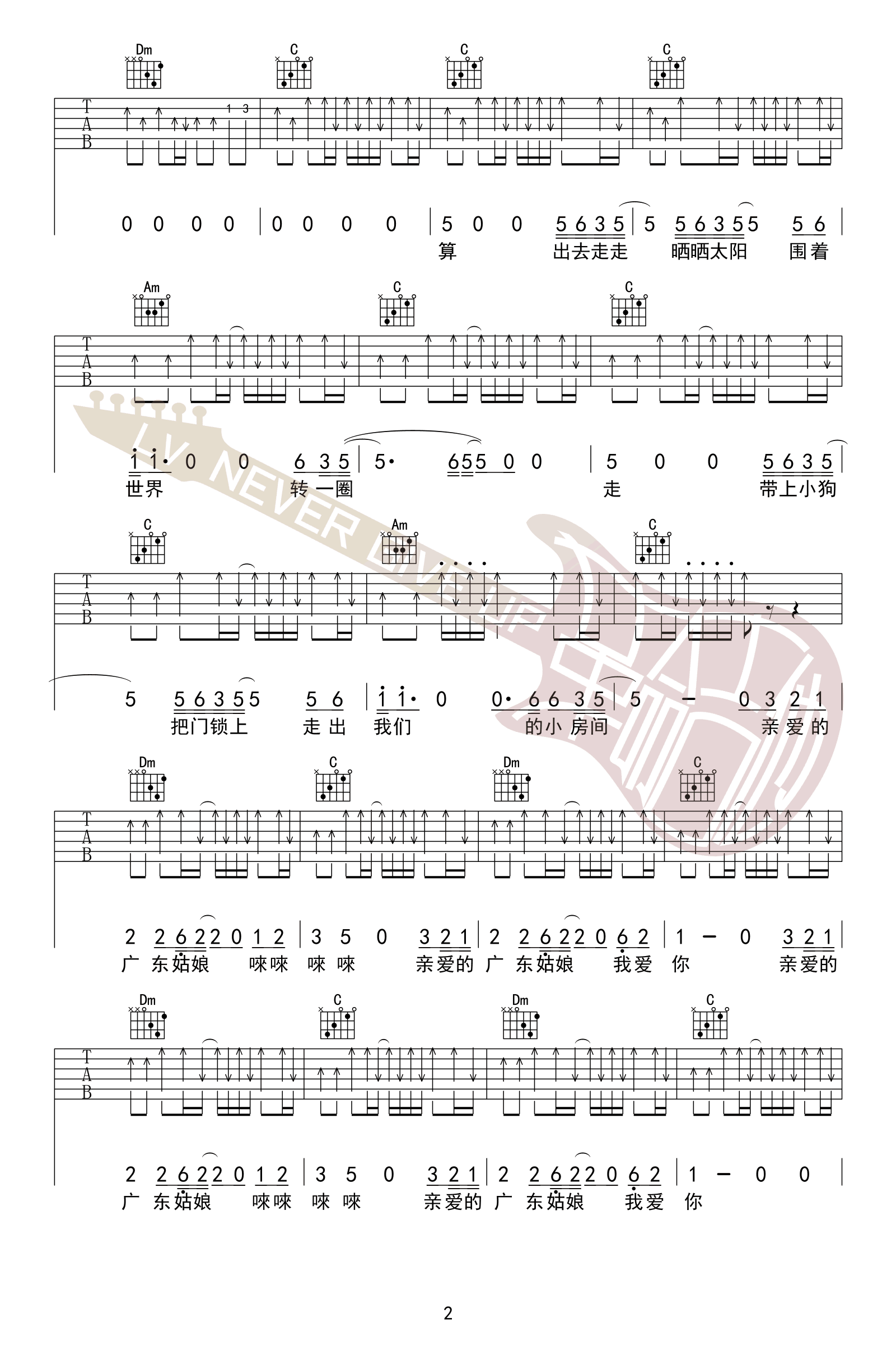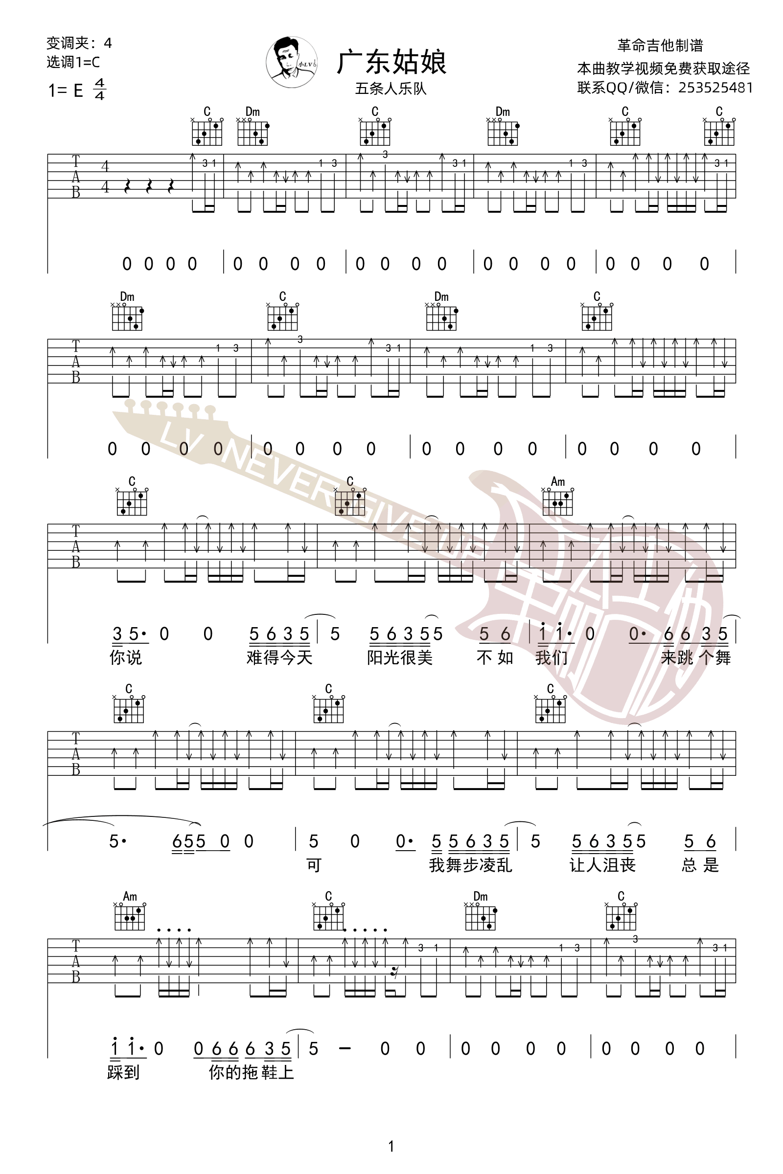 曲谱介绍: 五条人《广东姑娘》吉他谱,原调E选调C,变调夹四品。广东姑娘吉他弹唱谱,六线谱共四张图片谱例。感谢革命吉他编配分享。 五条人乐队一首极度好听,听完极度舒适的《广东姑娘》,是仁科写给女朋友的,歌词简单明了,大概在讲:阴雨连绵的日子过去了,我们不如来跳个舞吧!带上小狗,走出房间,一起去散散步吧!随之就是几句“亲爱的广东姑娘,我爱你……