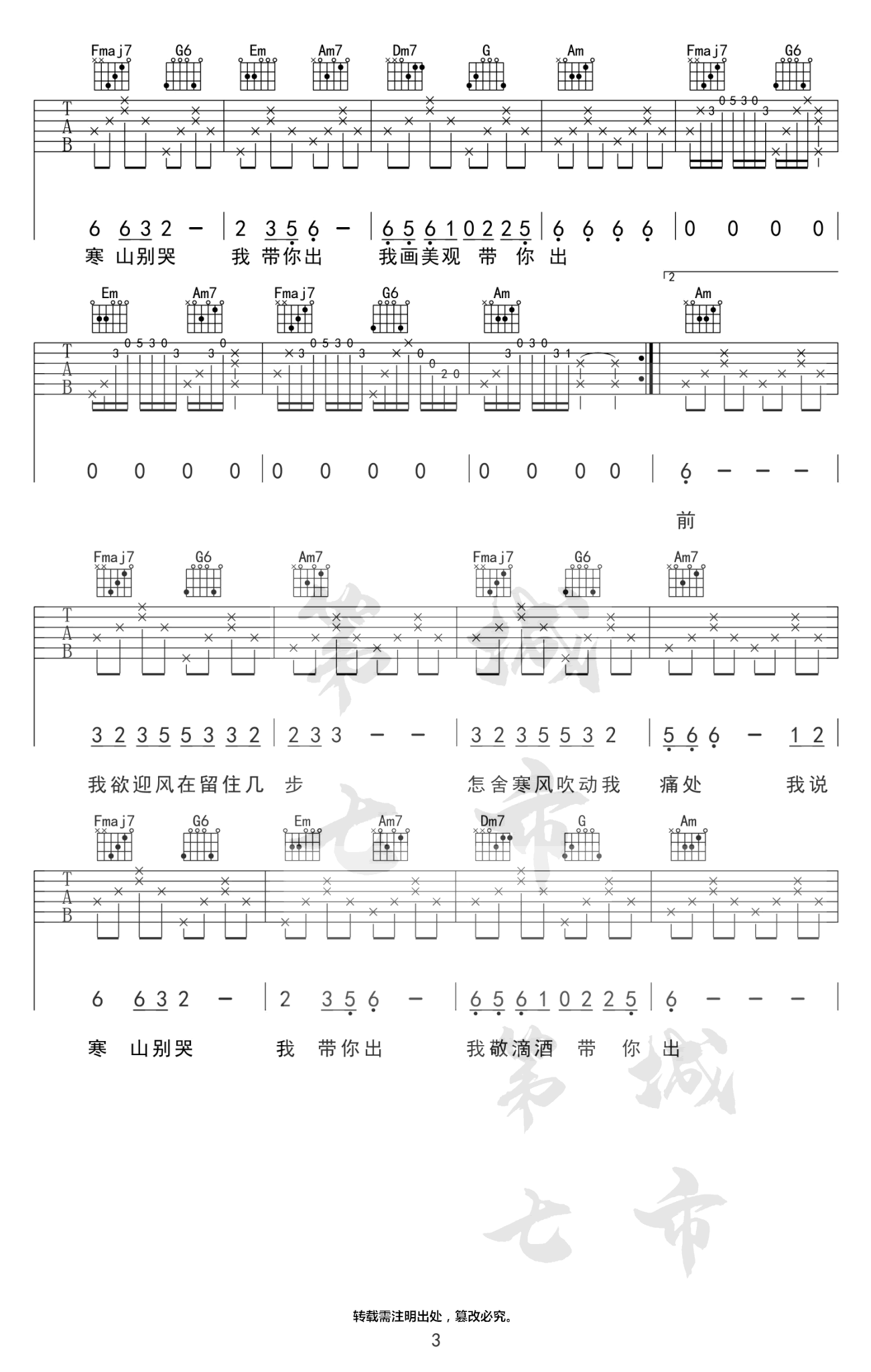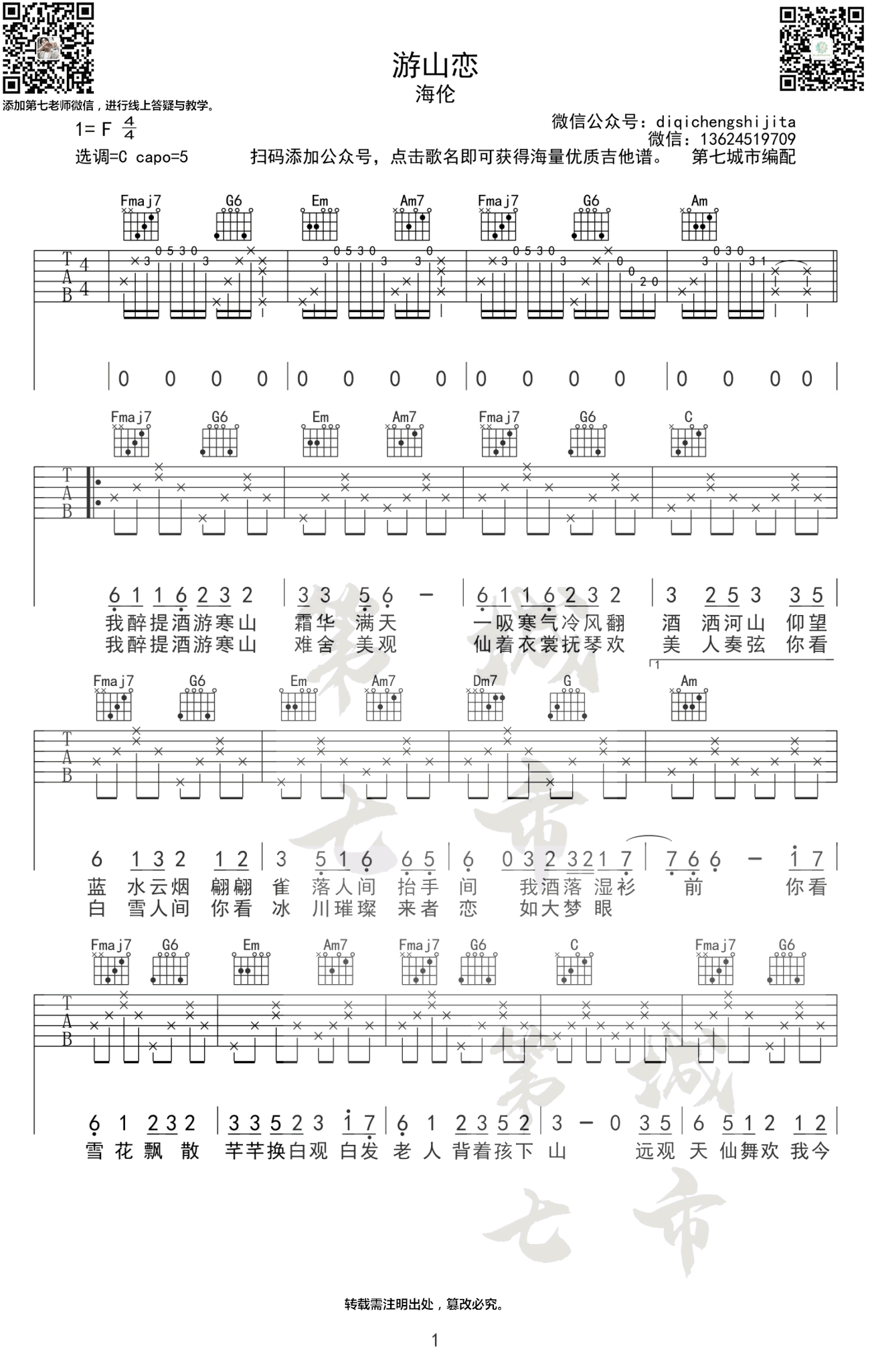 曲谱介绍: 海伦《游山恋》吉他谱,一首超火的古风歌曲,原调F,曲谱采用了C调指法,变调夹夹第五品位置。游山恋吉他弹唱谱,完整版共四张图片六线谱 最近抖音上又一首戏腔唱法的歌曲火了,婉转动听又略带沧桑感的歌声,让人不由得闭上眼睛沉醉其境,带你走遍人生风景,带你尝遍世间幸福,一别寒山我何时归来,回首你却已不在眼前。