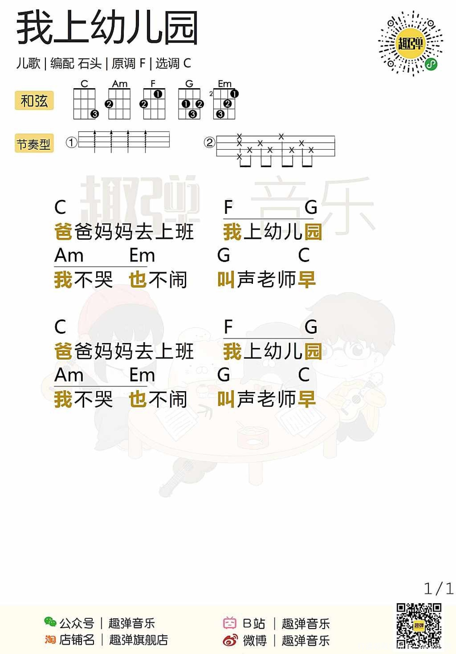 曲谱介绍: 儿歌《我上幼儿园》尤克里里谱,共有1张高清图谱,免翻页排版设计。