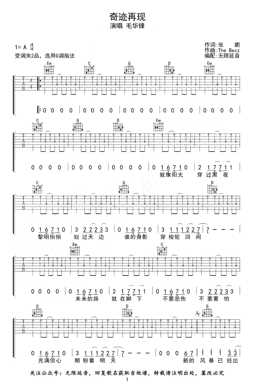 曲谱介绍: 奇迹再现吉他谱,毛华锋演唱,《迪迦奥特曼》日本动漫片头曲,我们每个人都是正义力量的光明人间体。有你的地方就能闪耀光芒,有光的地方就有迪迦,有迪迦就有奥特曼。我们每个人,都是奥特曼。 一首热血的歌曲带给大家,《奇迹再现》吉他弹唱谱,https://www.kanpula.com/原调A选调G,变调夹夹第二品,两张图片六线谱。
