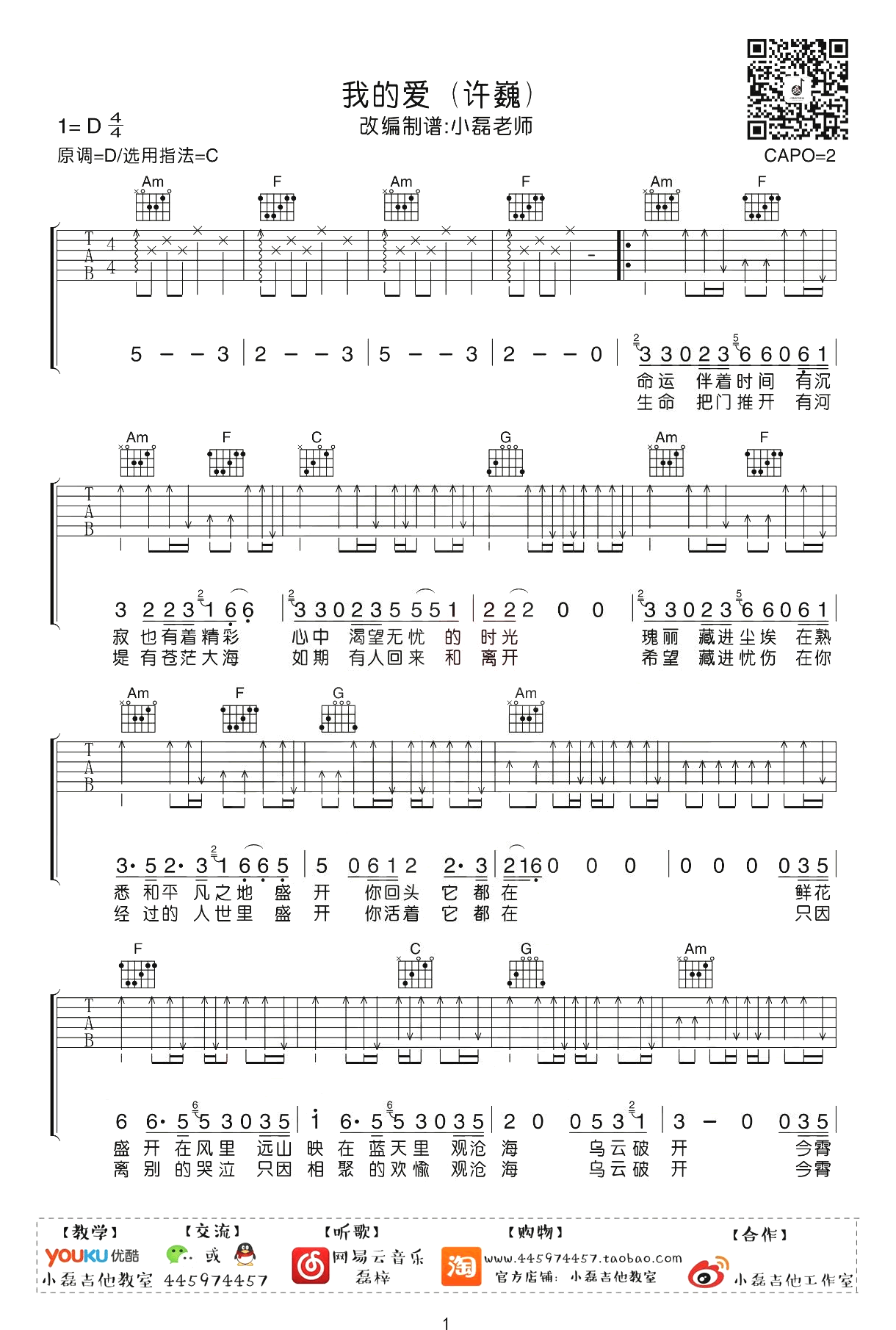 曲谱介绍: 吉他弹唱演示及视频教学 我的爱吉他谱_许巍_《我的爱》C调六线谱_吉他弹唱教学分享,《我的爱》是由许巍创作并演唱的一首歌,正如歌中所唱,日复一日的平凡生活伴着时间流过,其中有沉寂也有精彩、有瑰丽也有尘埃。心安才能好眠,让我们把心门推开,让目力所及变得广阔,让心底的那份爱突破牵绊、有处安放、有所期待。