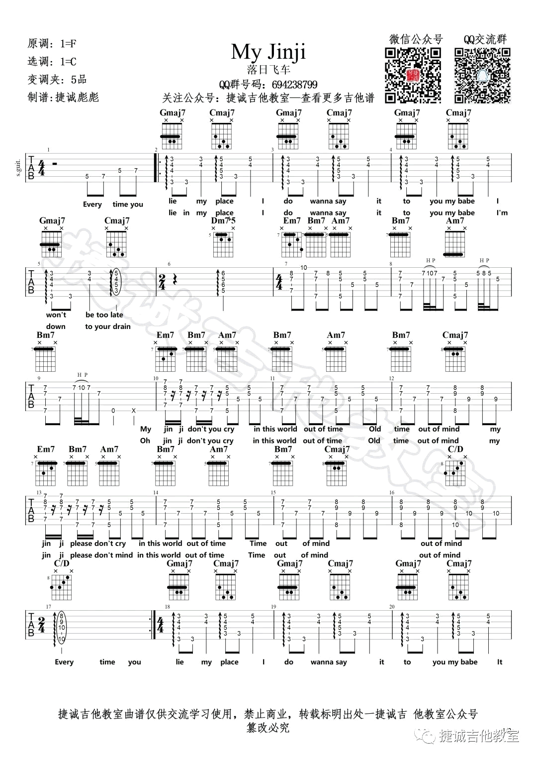 曲谱介绍: My《MyJinji》吉他弹唱谱,采用C调指法编配,捷诚吉他教室编配出品,共有2张高清图谱,免翻页排版设计。