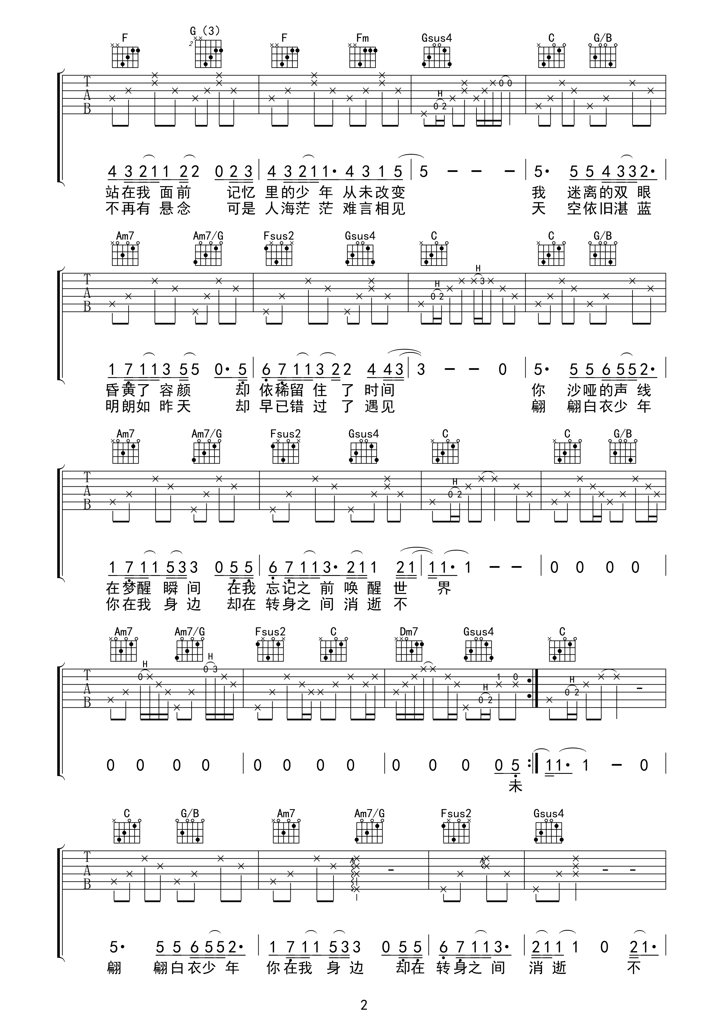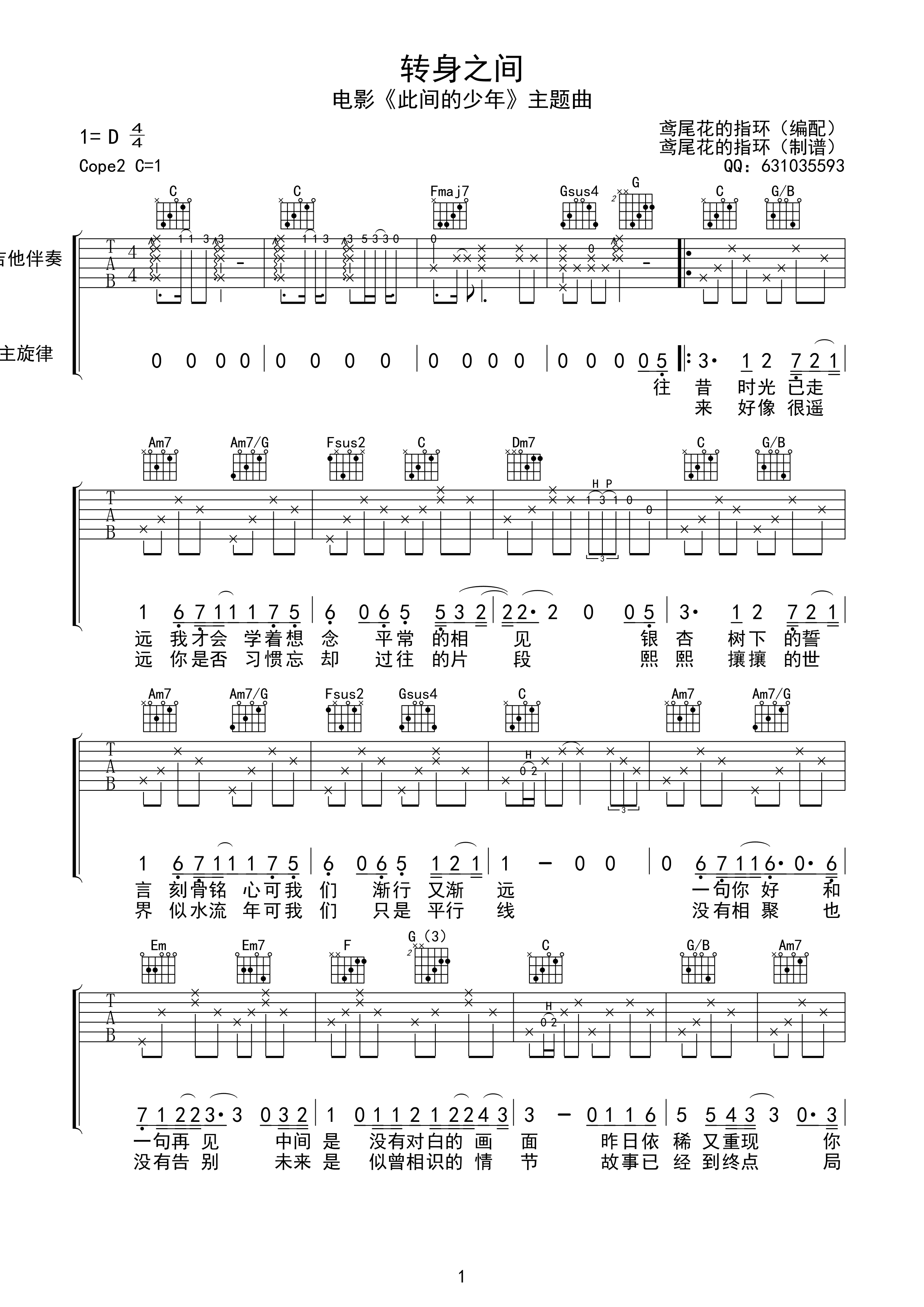 曲谱介绍: 孙欣《转身之间》吉他弹唱谱,采用C调指法编配,鸢尾花的指环编配出品,共有3张高清图谱。