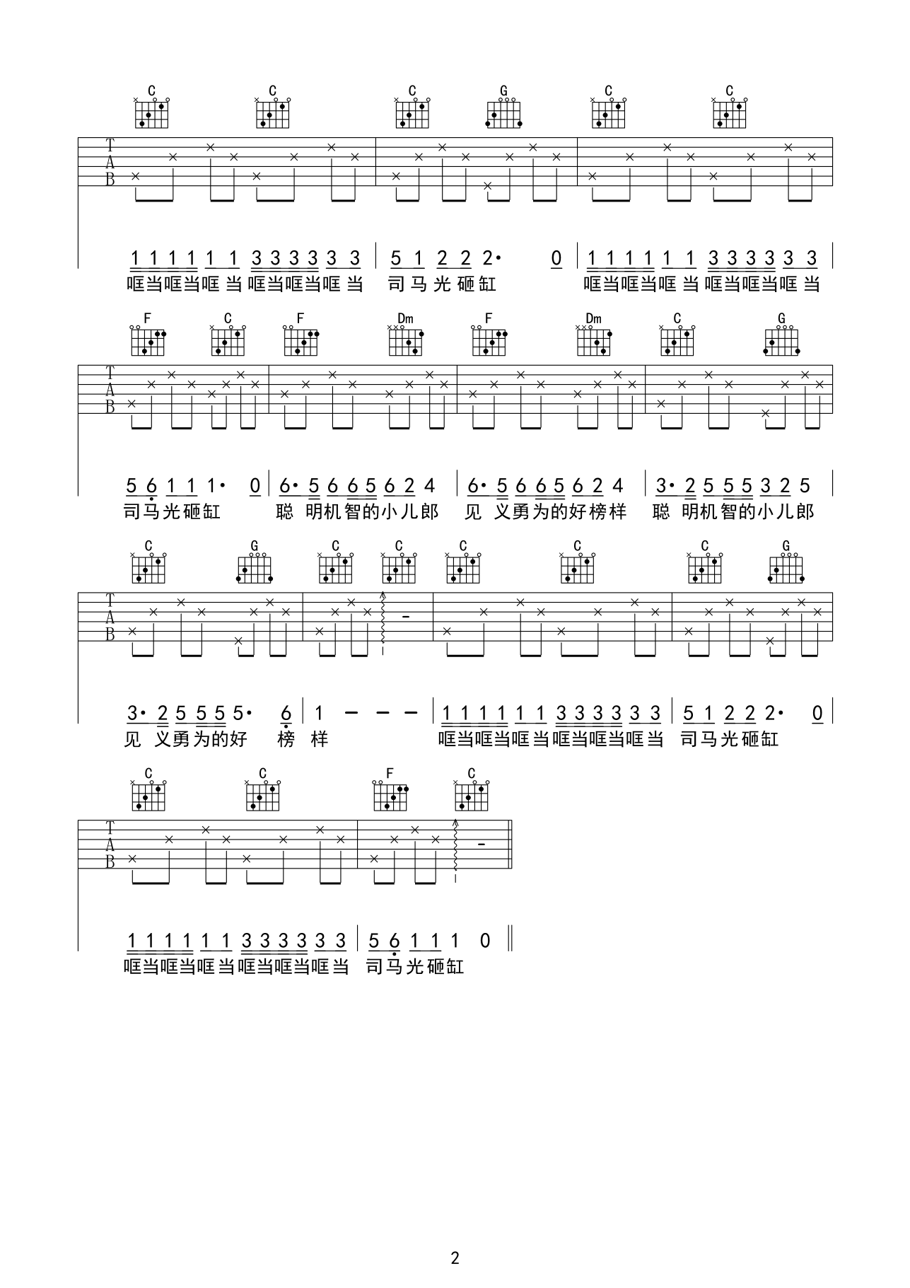 曲谱介绍: 儿童歌曲《司马光砸缸》吉他弹唱谱,采用C调指法编配,齐元义编配出品,共有2张高清图谱,免翻页排版设计。