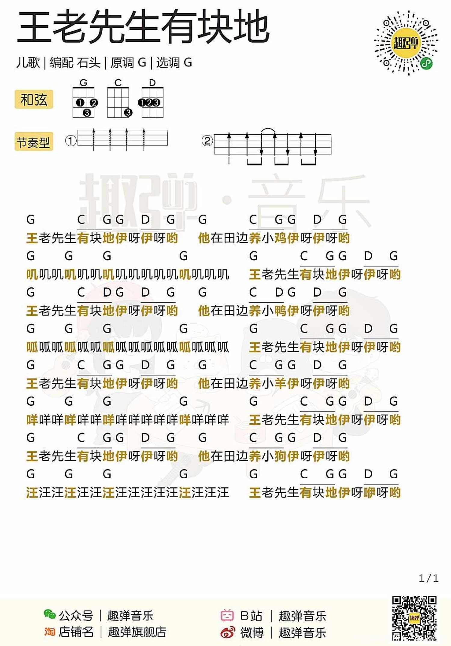 曲谱介绍: 儿歌《王老先生有块地》尤克里里谱,共有1张高清图谱,免翻页排版设计。