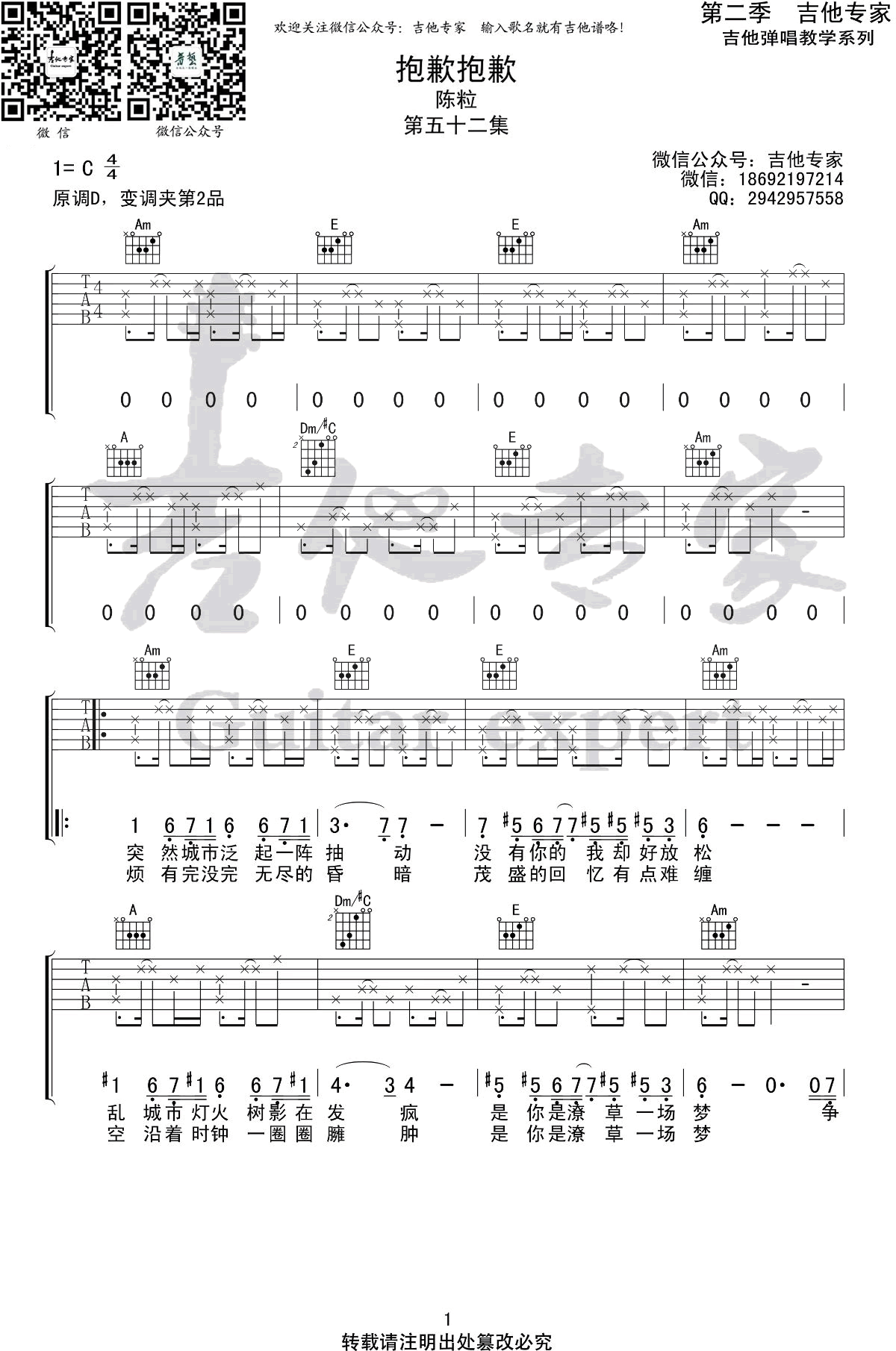 曲谱介绍: 陈粒《抱歉抱歉》吉他弹唱谱,采用C调指法编配,吉他专家编配出品,共有3张高清图谱。