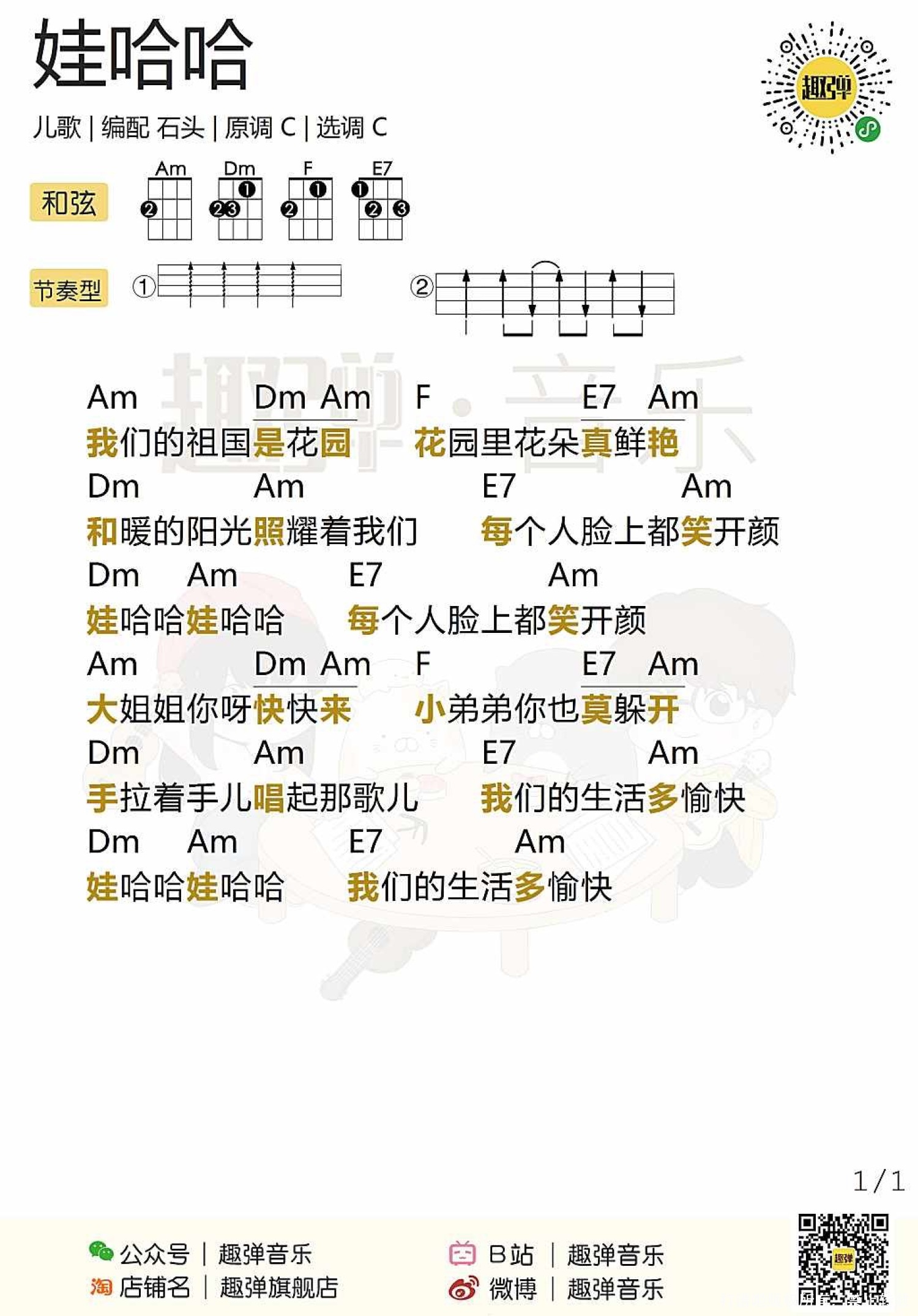 曲谱介绍: 儿歌《娃哈哈》尤克里里谱,共有1张高清图谱,免翻页排版设计。