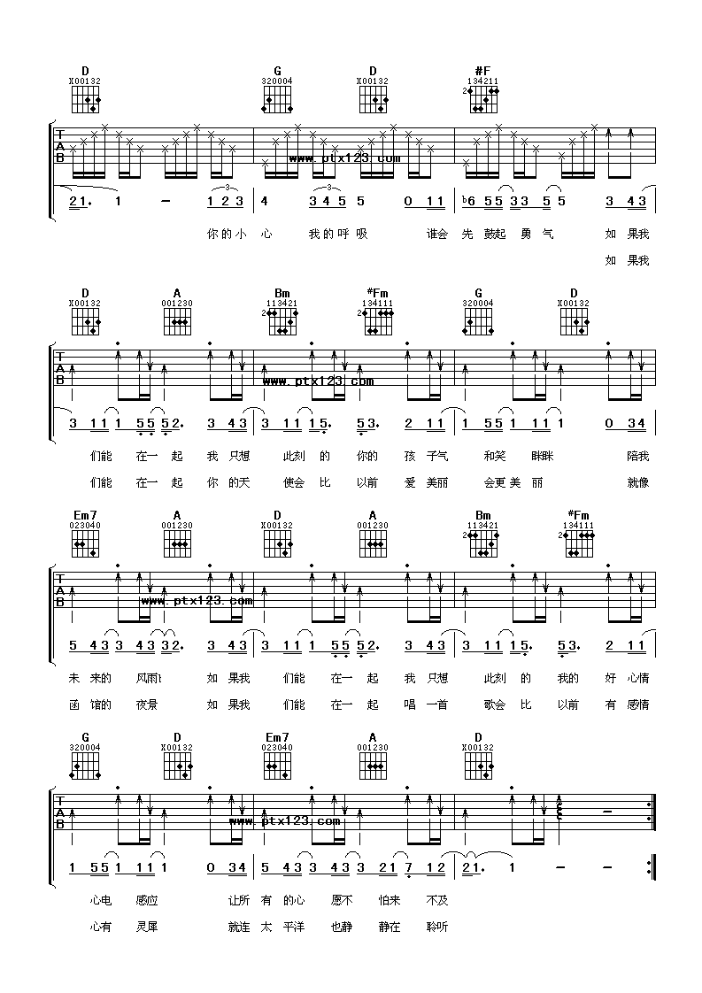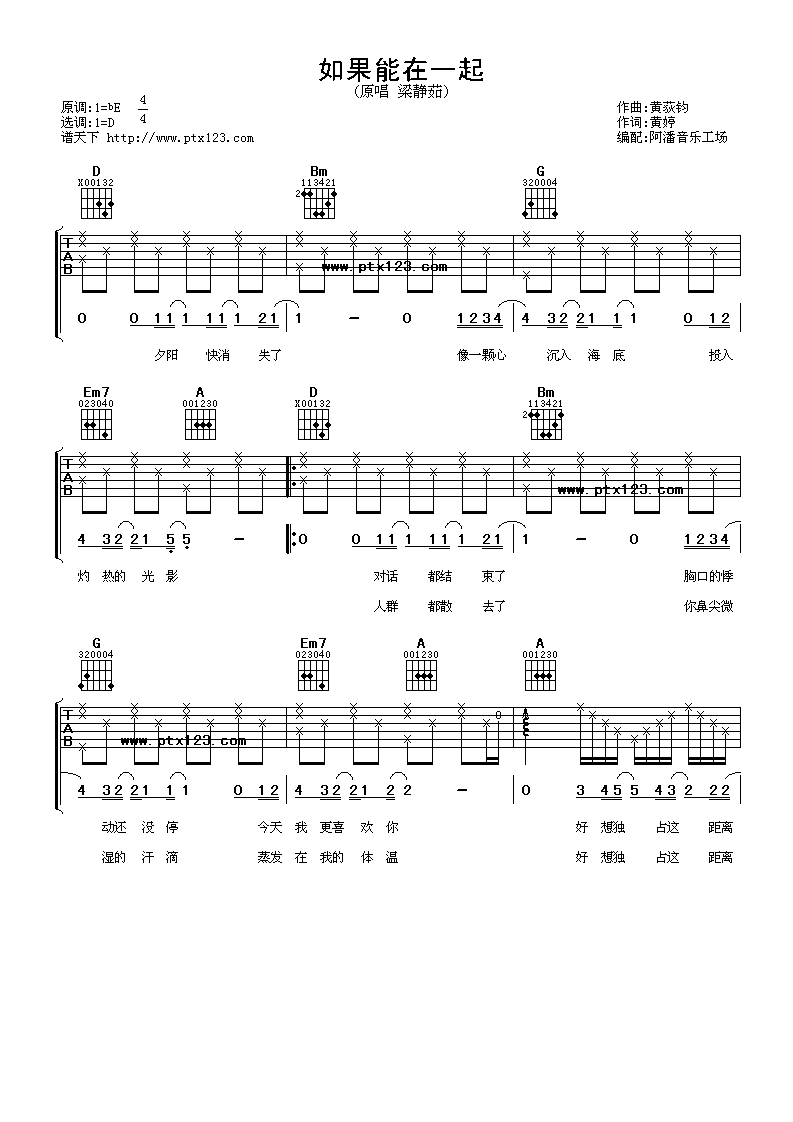 曲谱介绍: 梁静茹《如果能在一起》吉他弹唱谱,采用D调指法编配,阿潘音乐工场编配出品,共有2张高清图谱,免翻页排版设计。