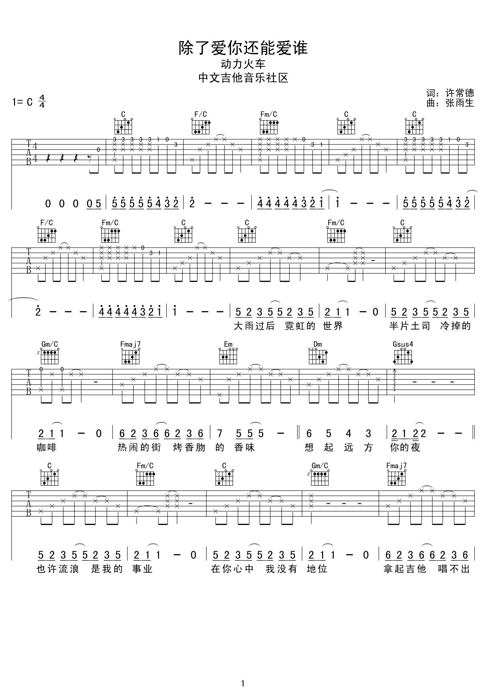 曲谱介绍: 动力火车《除了爱你还能爱谁》吉他弹唱谱,采用C调指法编配,中文吉他音乐社区编配出品,共有4张高清图谱。