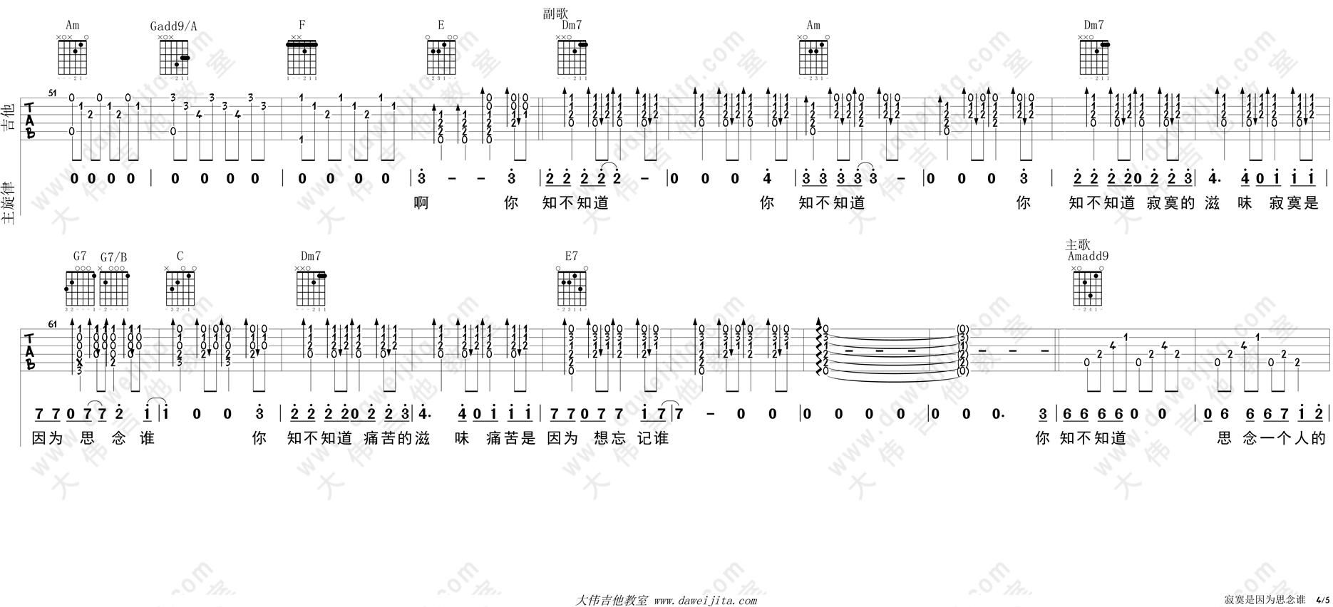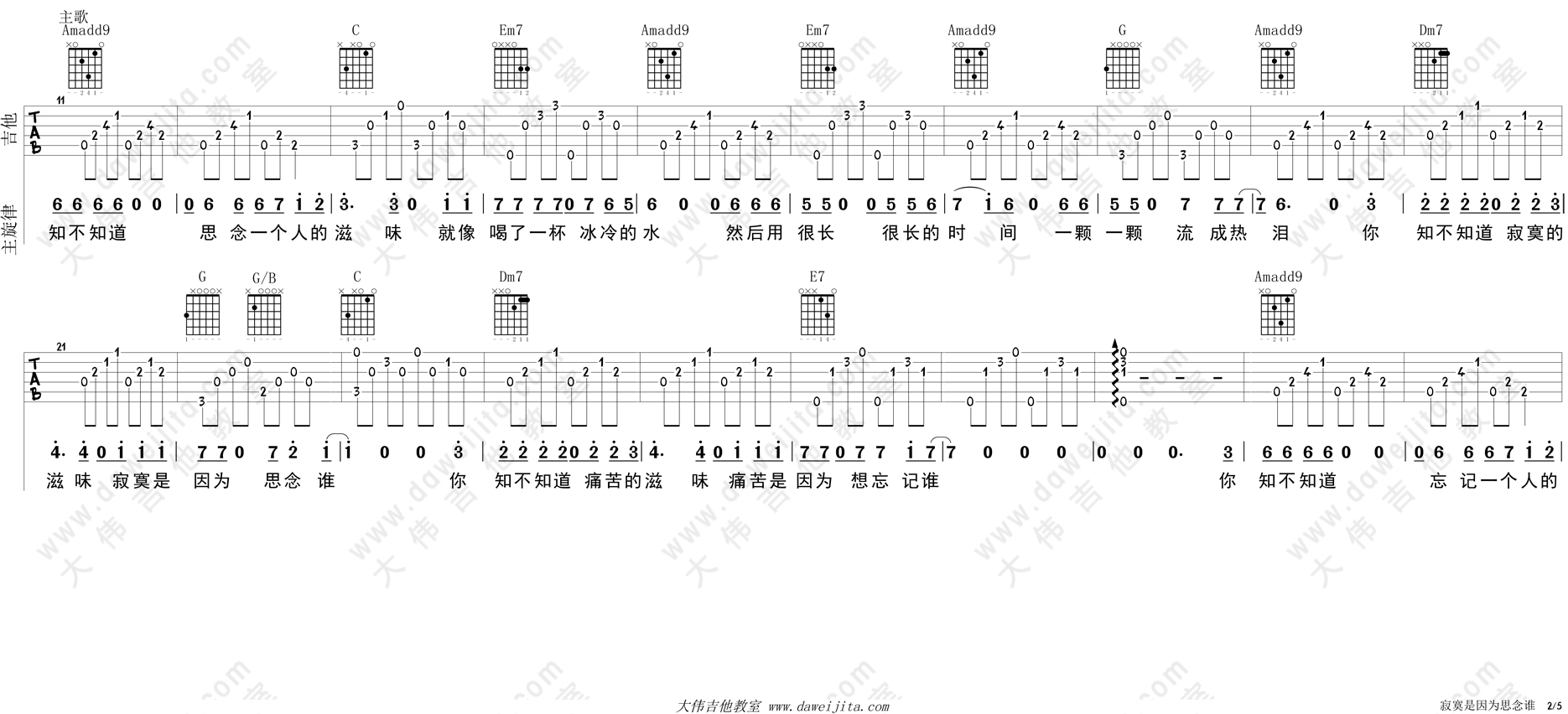 曲谱介绍: 张磊《寂寞是因为思念谁》吉他弹唱谱,采用C调指法编配,大伟吉他教室编配出品,共有5张高清图谱。