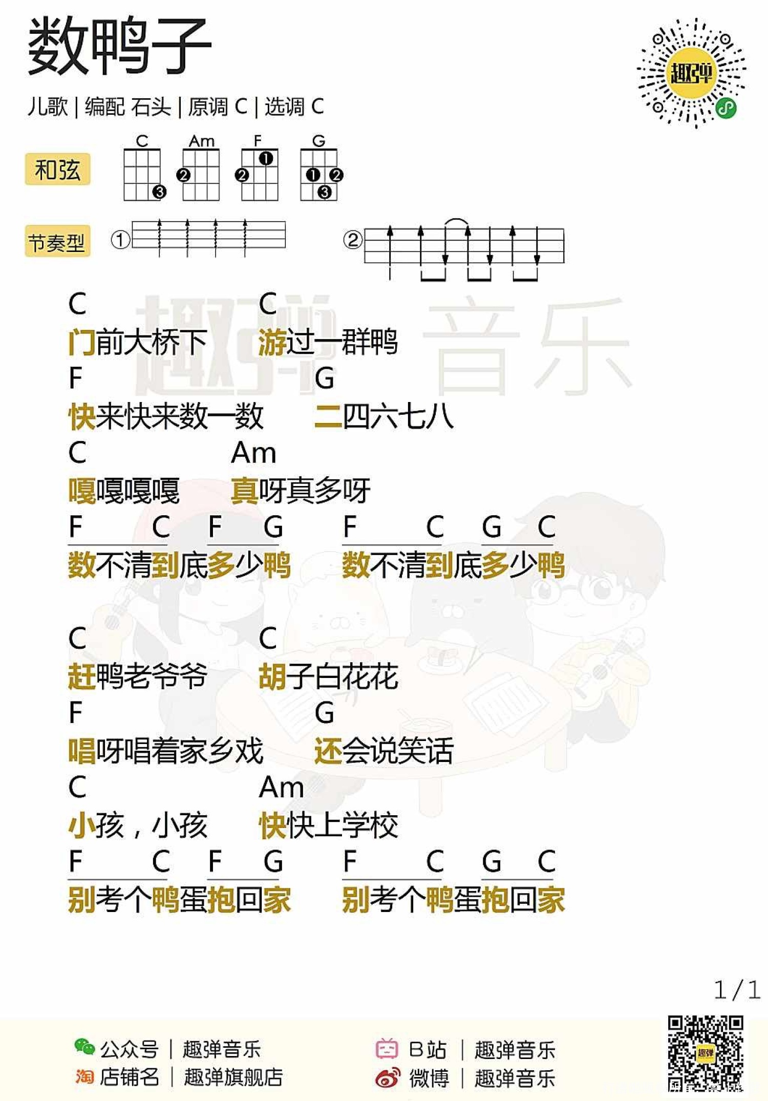 曲谱介绍: 儿歌《数鸭子》尤克里里谱,共有1张高清图谱,免翻页排版设计。