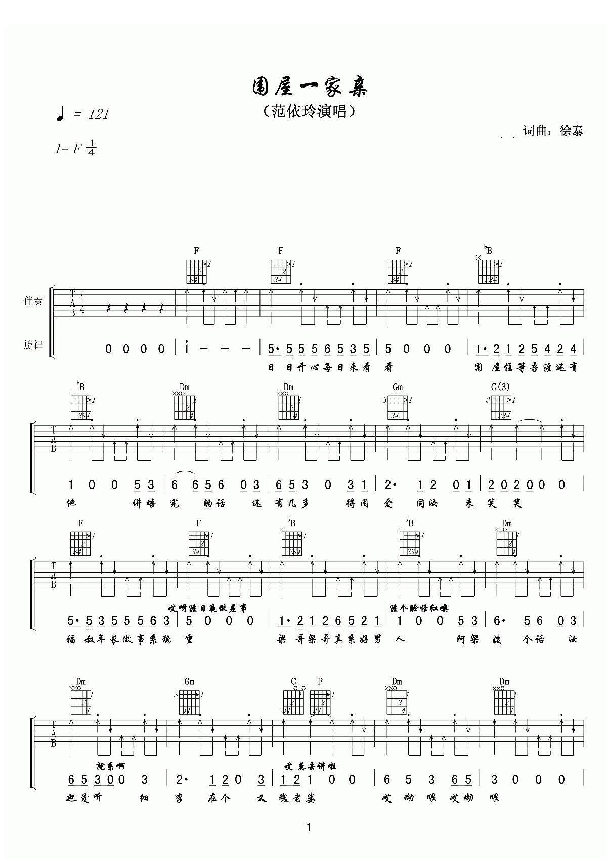 曲谱介绍: 范依玲《围屋一家亲》吉他弹唱谱,采用C调指法编配,共有2张高清图谱,免翻页排版设计。