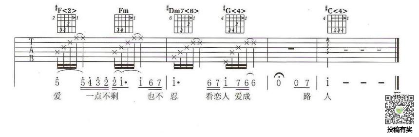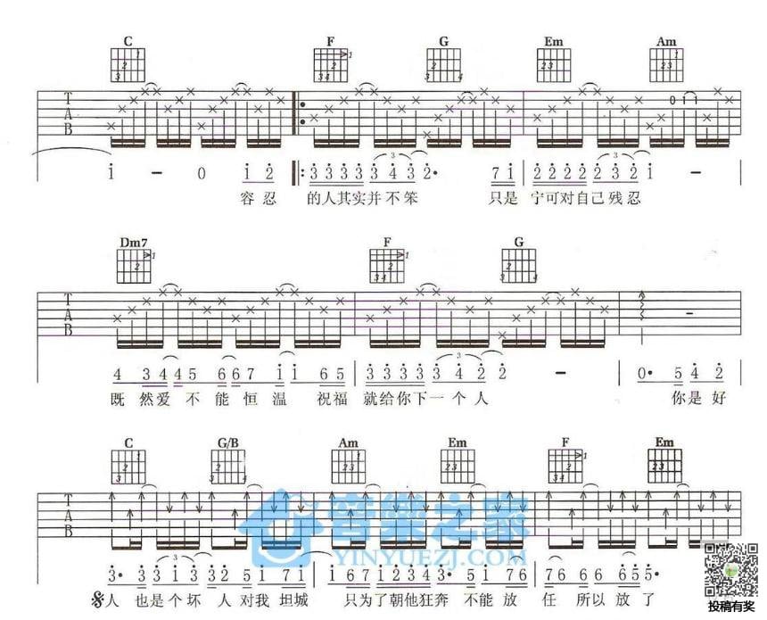 曲谱介绍: 方烔镔《坏人》吉他弹唱谱,采用C调指法编配,音乐之家编配出品,共有6张高清图谱。