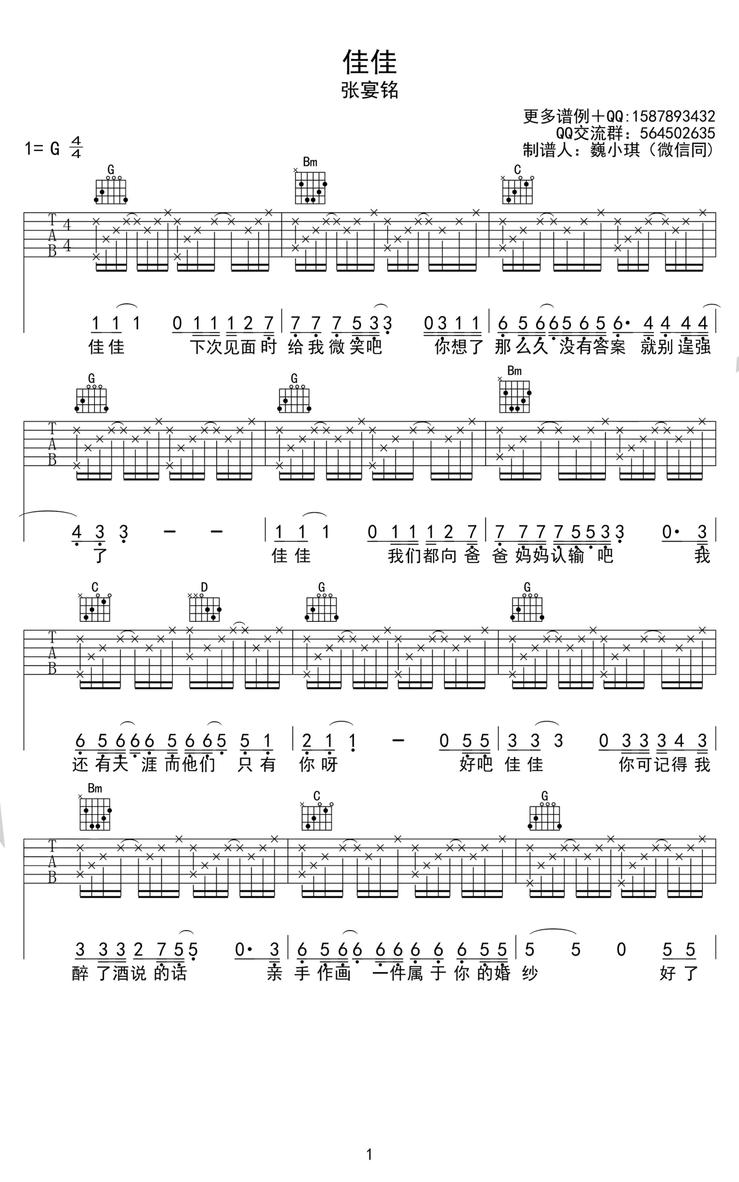 佳佳吉他谱 - 张宴铭 - G调吉他弹唱谱