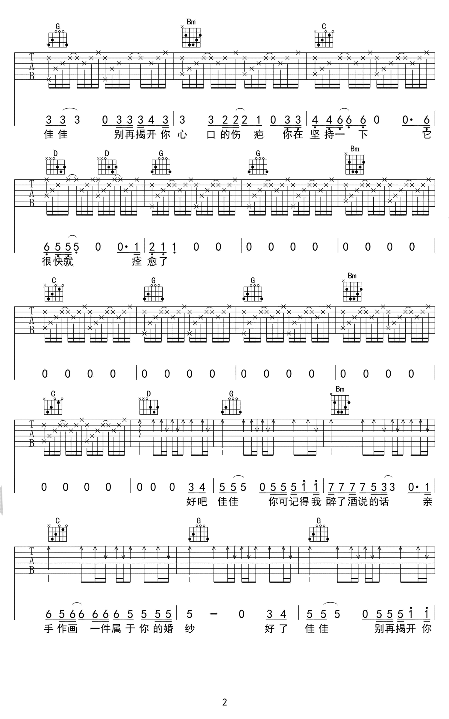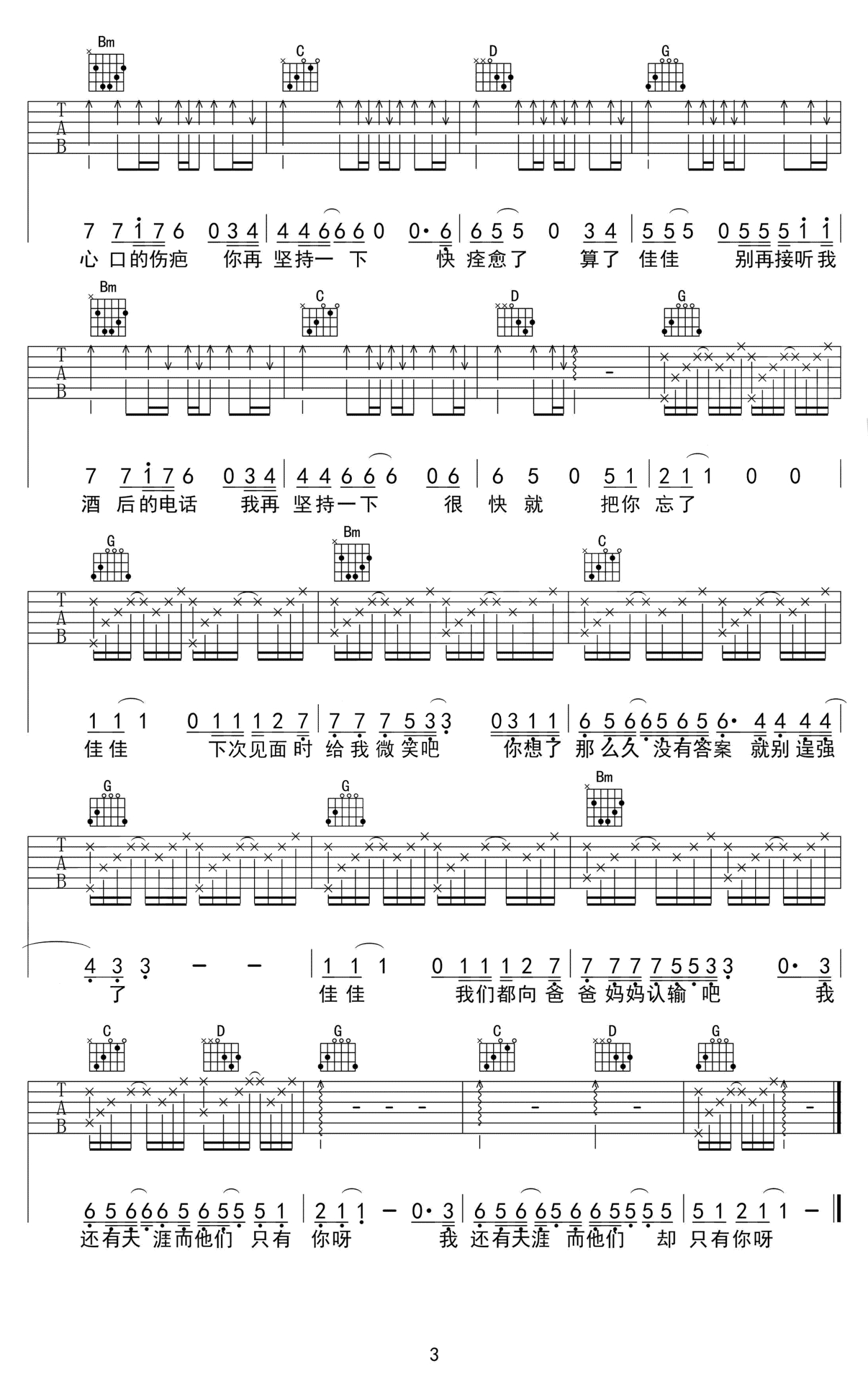 曲谱介绍: 《佳佳》吉他谱,G调弹唱谱,高清图片谱。张宴铭演唱的一首原创歌曲,被感动的不是民谣本身,而是这首歌会有你的故事。那些年没能说出口的分手理由,都被老张写成了歌。一百多个字,没有撕心裂肺的咆哮,没有深夜的痛哭流涕,只有平静到几近理智的劝解和安慰。