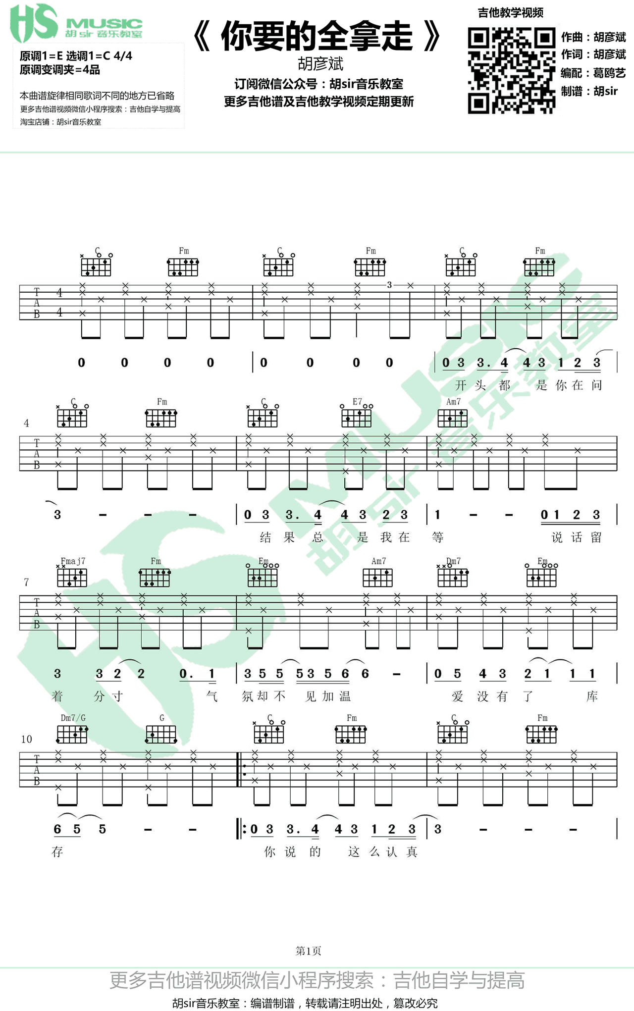 曲谱介绍: 胡彦斌《你要的全拿走》吉他弹唱谱,采用C调指法编配,胡sir音乐教室编配出品,共有3张高清图谱。