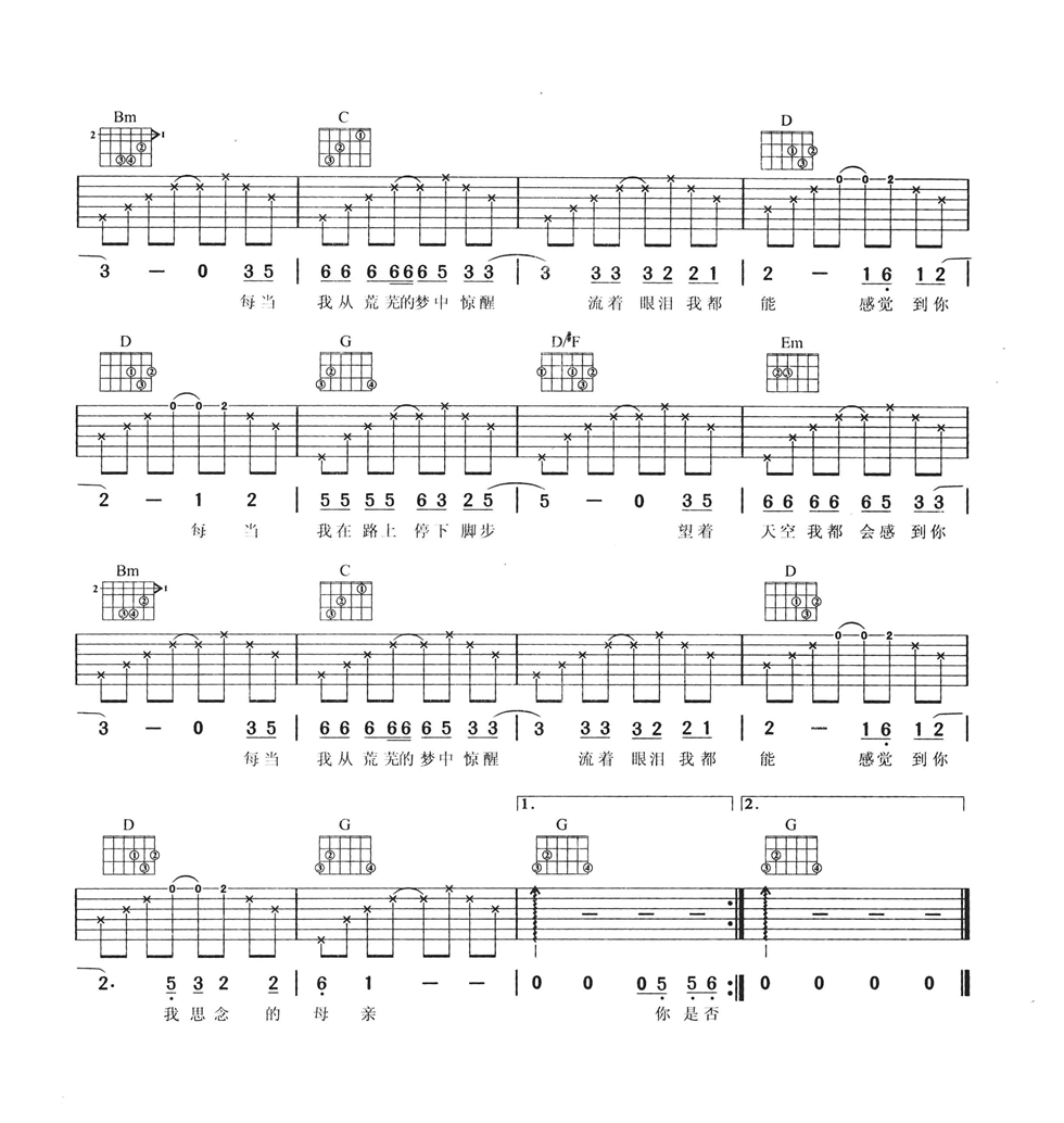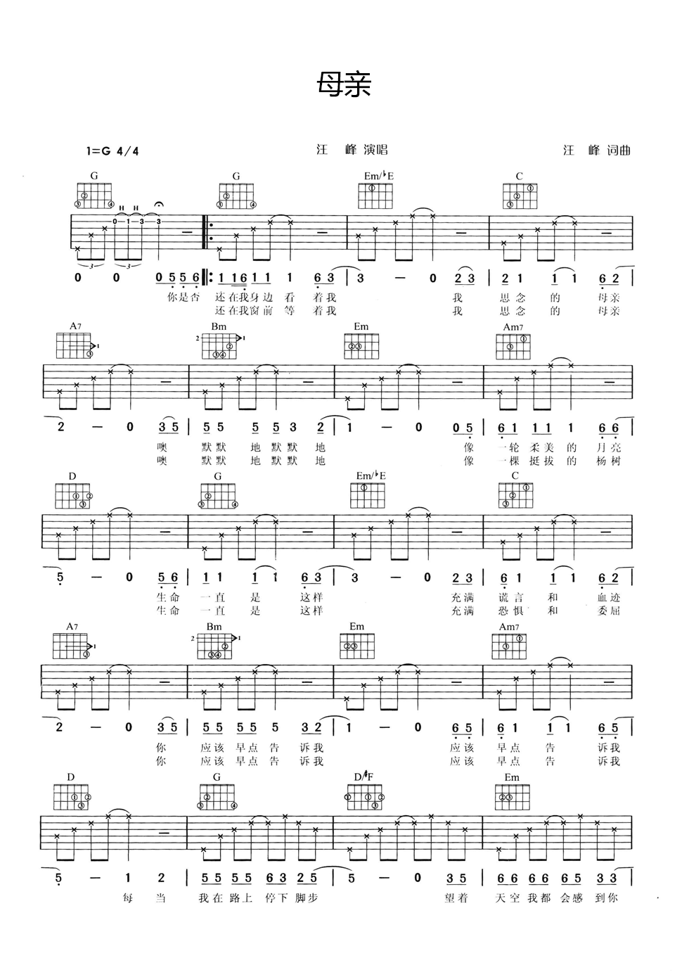 曲谱介绍: 汪峰《母亲》吉他弹唱谱,采用G调指法编配,共有2张高清图谱,免翻页排版设计。