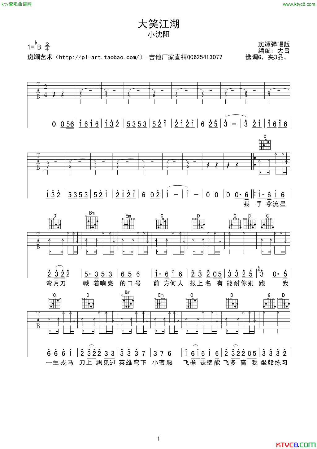 曲谱介绍: 高进《大笑江湖》吉他弹唱谱,采用B调指法编配,大吕编配出品,共有3张高清图谱。