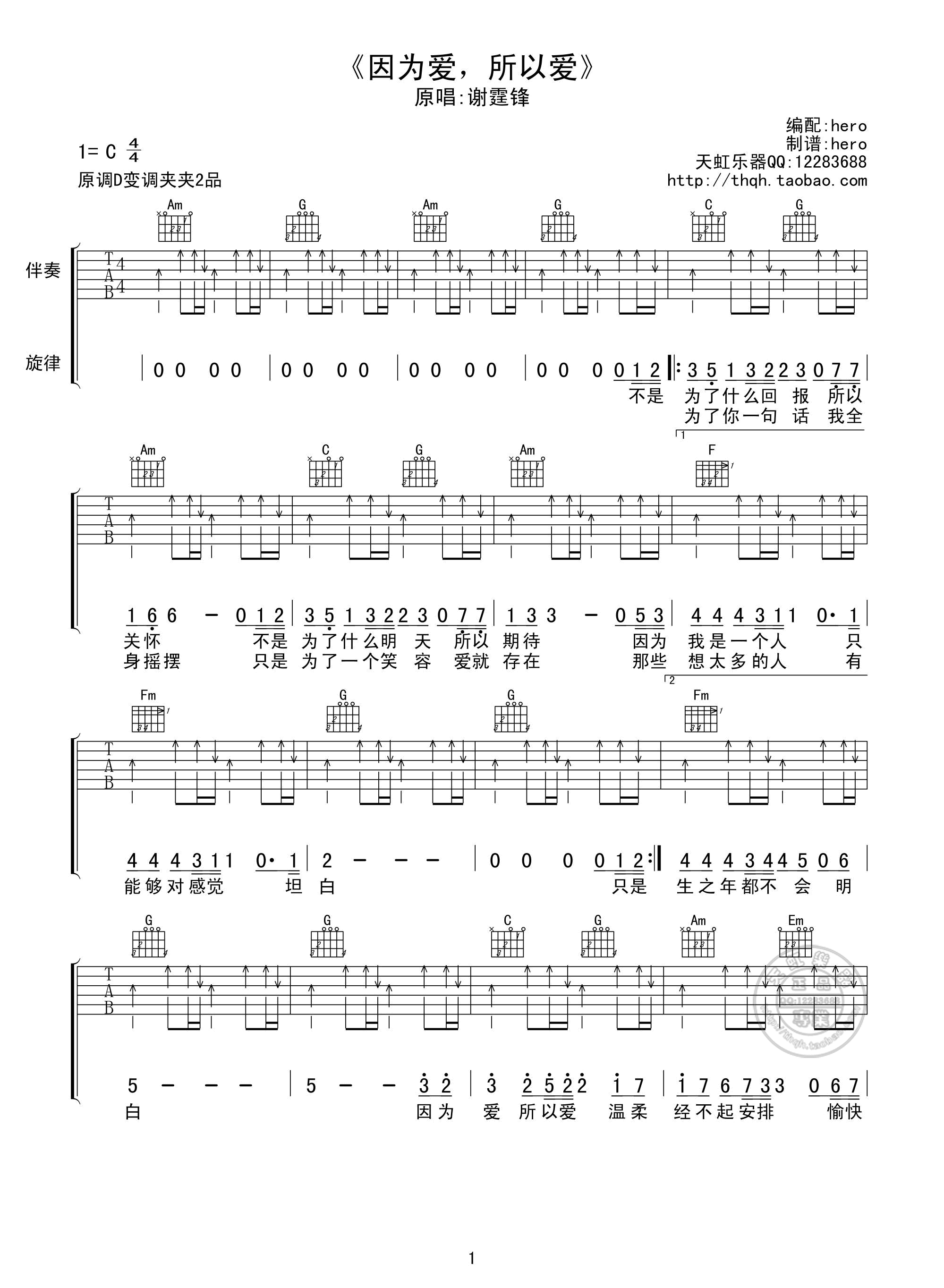 曲谱介绍: 谢霆锋《因为爱所以爱》吉他弹唱谱,采用C调指法编配,天虹乐器编配出品,共有2张高清图谱,免翻页排版设计。