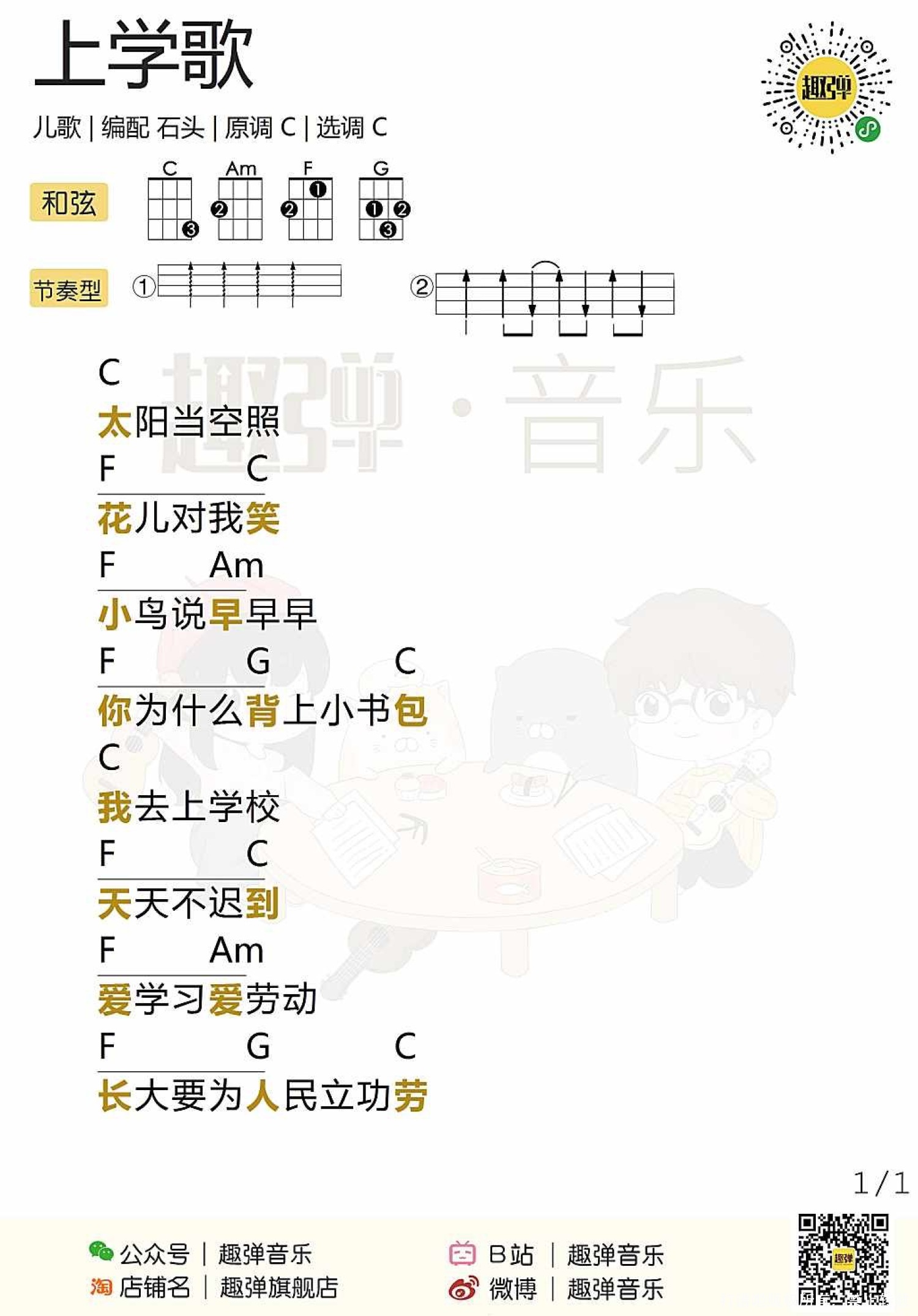 曲谱介绍: 儿歌《上学歌》尤克里里谱,共有1张高清图谱,免翻页排版设计。