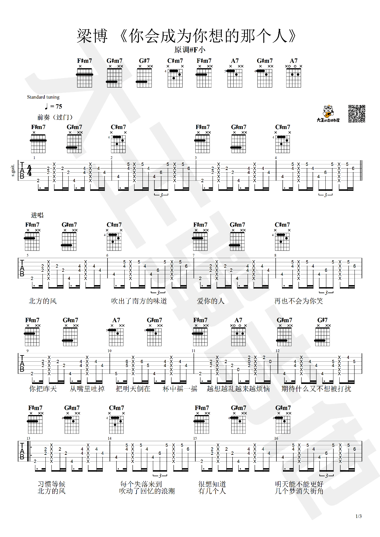 曲谱介绍: 梁博《你会成为你想的那个人》吉他弹唱谱,采用C调指法编配,大王弹吉他编配出品,共有3张高清图谱。