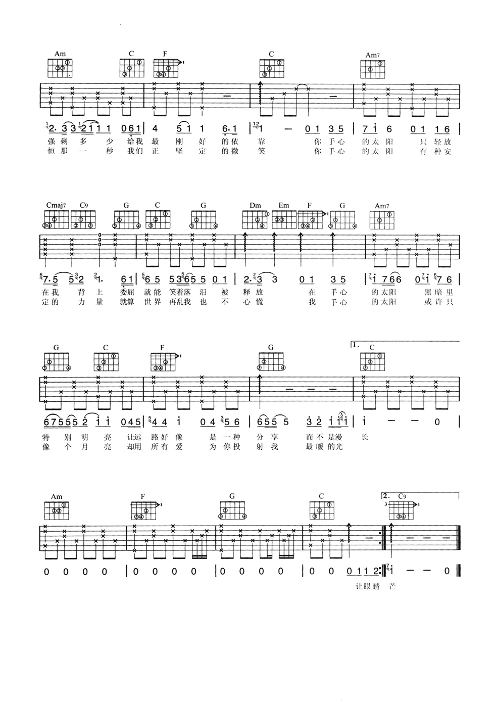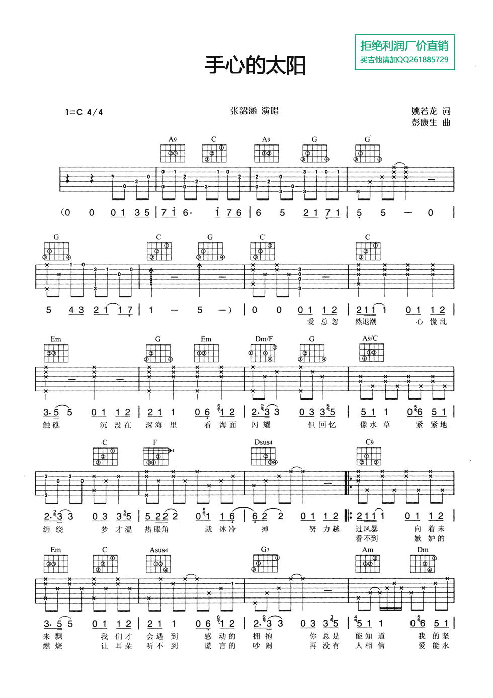 曲谱介绍: 张韶涵《手心的太阳》吉他弹唱谱,采用C调指法编配,共有2张高清图谱,免翻页排版设计。