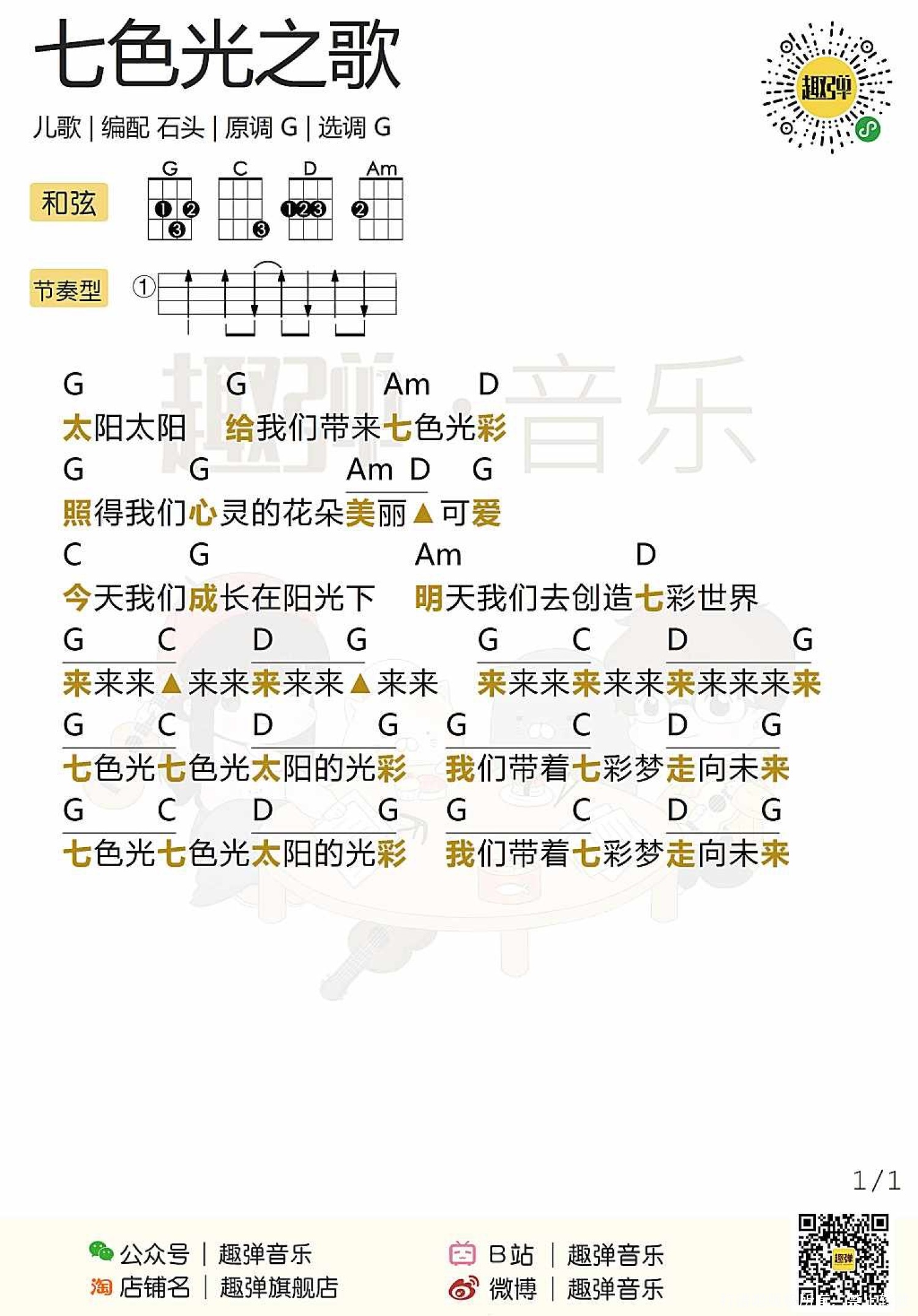 曲谱介绍: 儿歌《七色光之歌》尤克里里谱,共有1张高清图谱,免翻页排版设计。