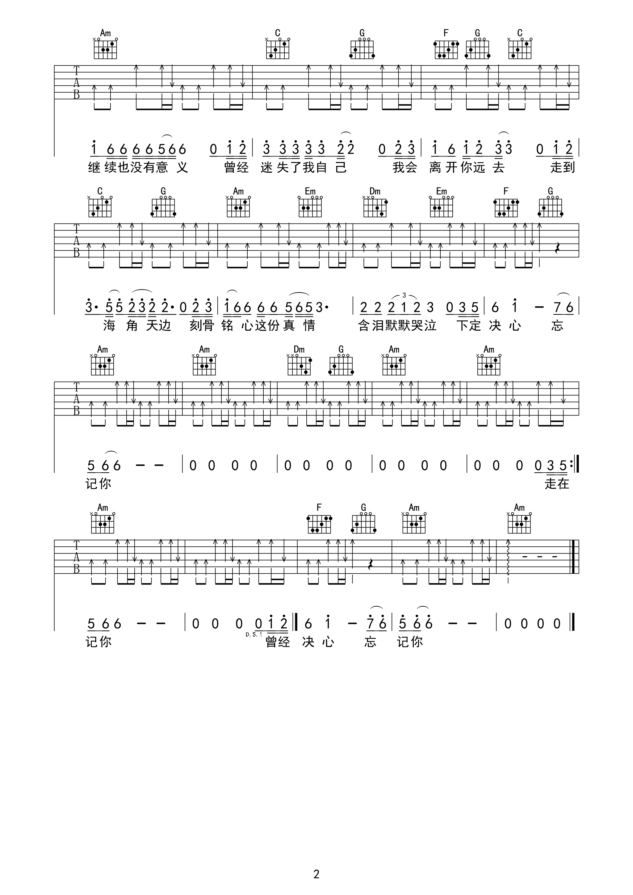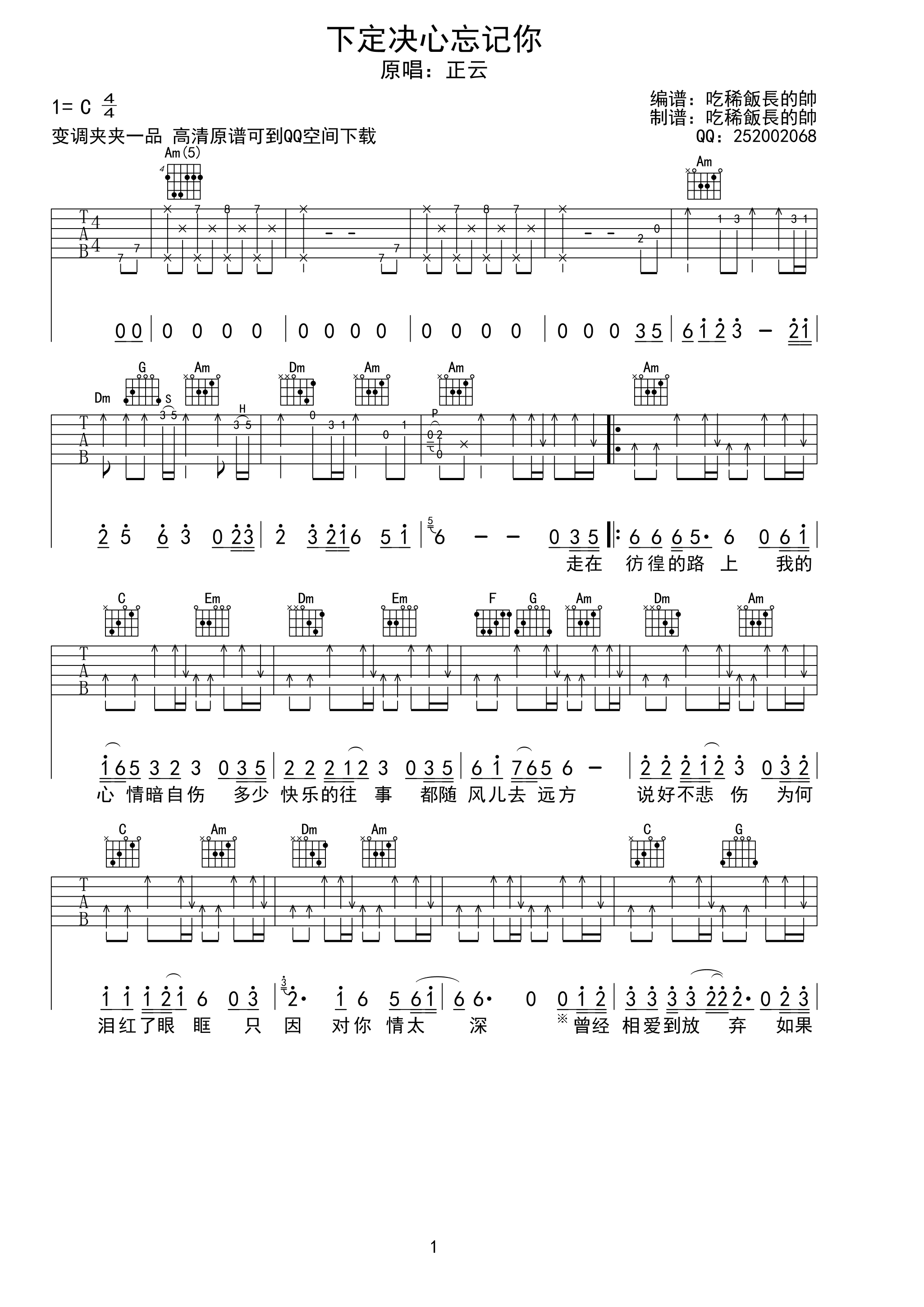 曲谱介绍: 附前奏《下定决心忘记你》吉他弹唱谱,采用C调指法编配,共有2张高清图谱,免翻页排版设计。