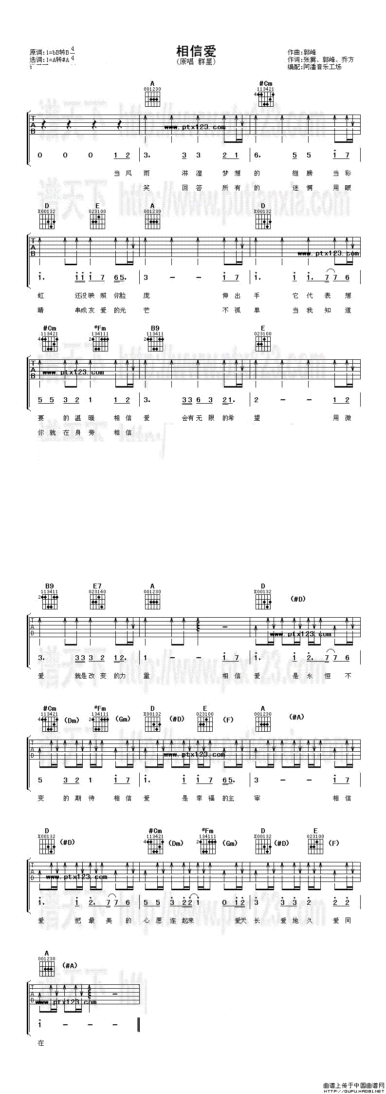 曲谱介绍: 郭峰《相信爱》吉他弹唱谱,采用A调指法编配,阿潘音乐工场编配出品,共有1张高清图谱,免翻页排版设计。