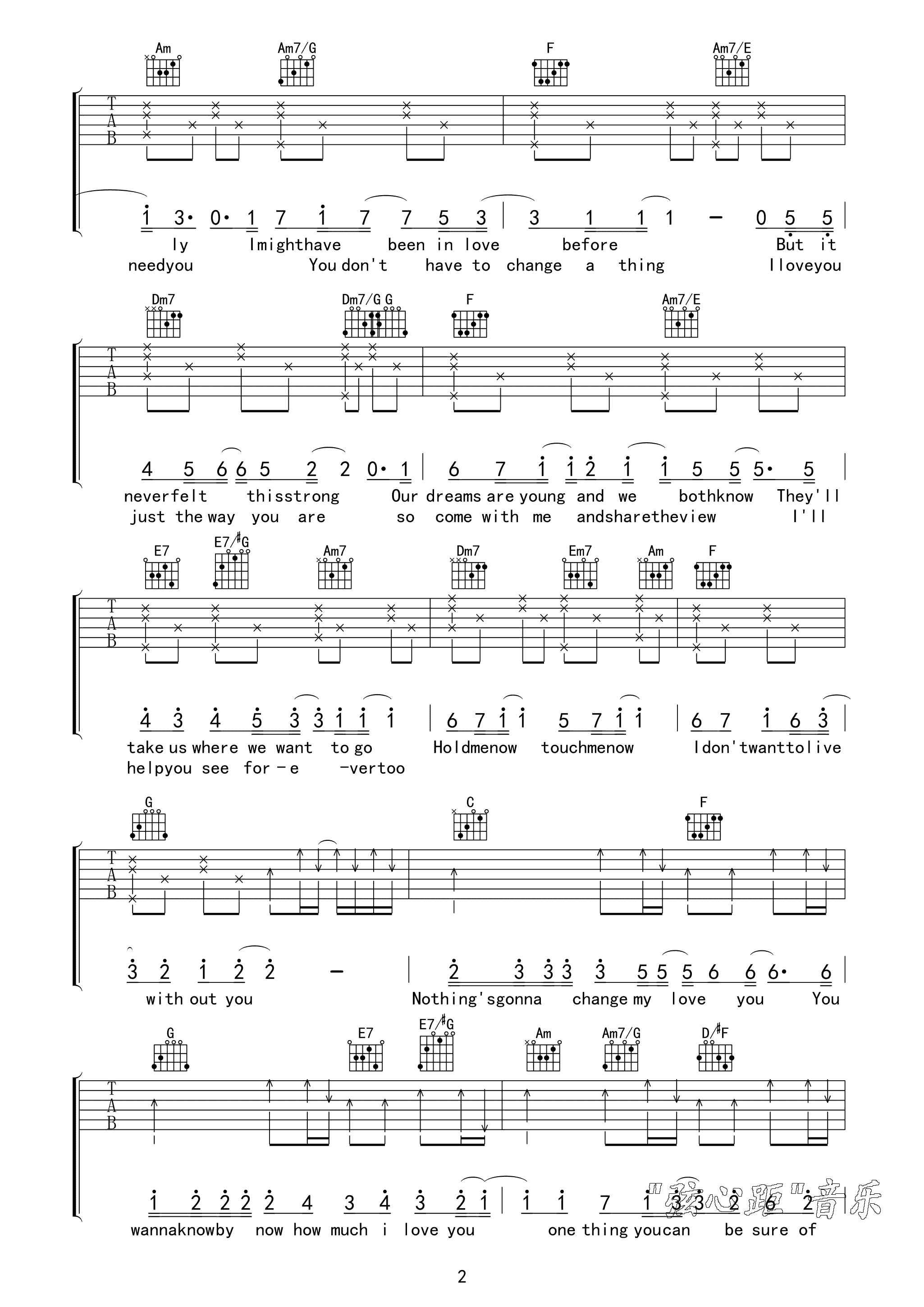 曲谱介绍: nothings《nothingsgonnachangemyloveforyou》吉他弹唱谱,采用C调指法编配,弦心距编配出品,共有3张高清图谱。