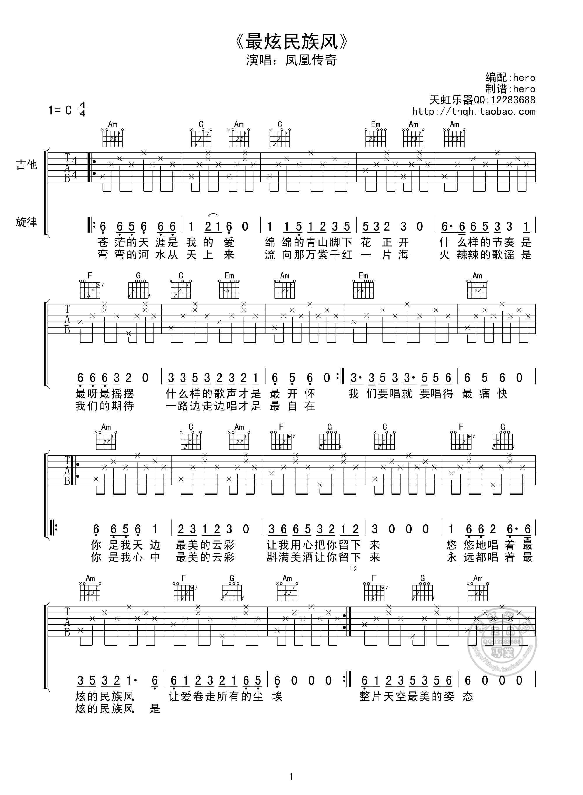 曲谱介绍: 凤凰传奇《最炫民族风》吉他弹唱谱,采用C调指法编配,天弘乐器编配出品,共有1张高清图谱,免翻页排版设计。