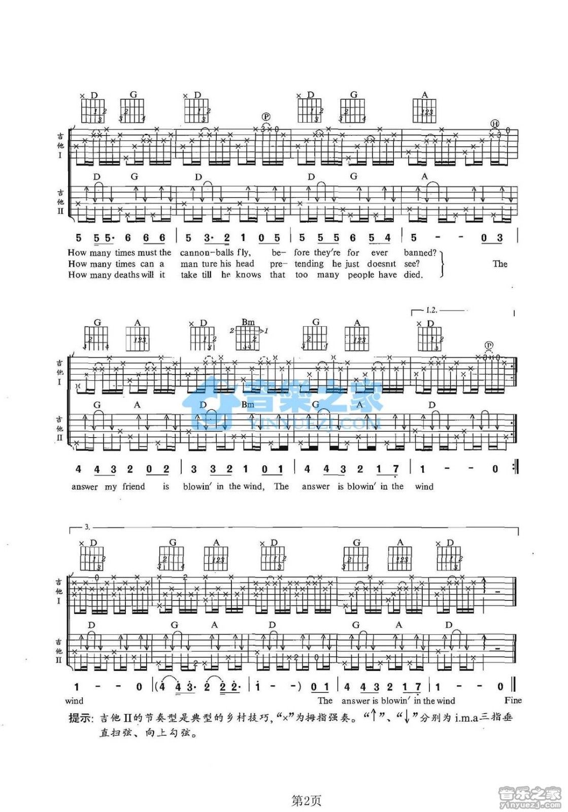 曲谱介绍: Blowin《BlowinInTheWind》吉他弹唱谱,采用D调指法编配,音乐之家编配出品,共有2张高清图谱,免翻页排版设计。