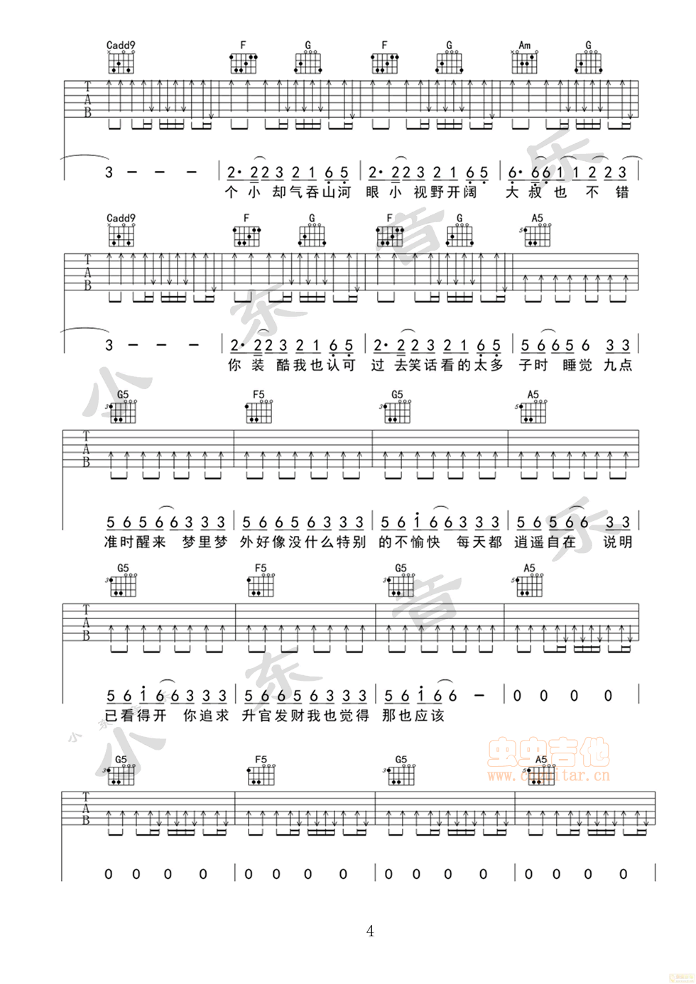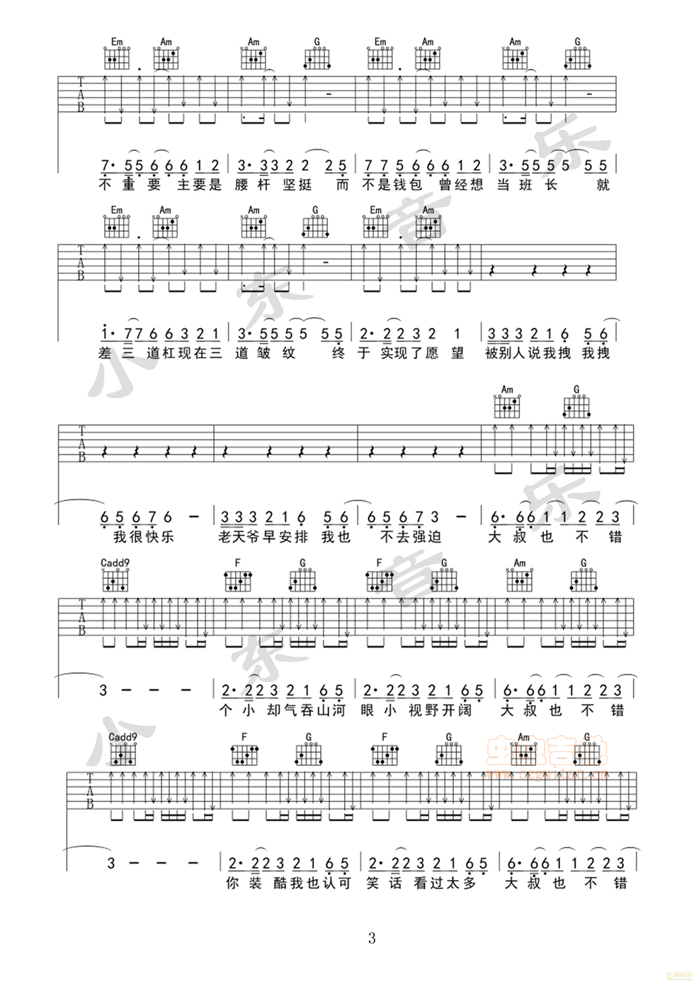 曲谱介绍: 杨坤《大叔也不错》吉他弹唱谱,采用D调指法编配,小东音乐编配出品,共有6张高清图谱。