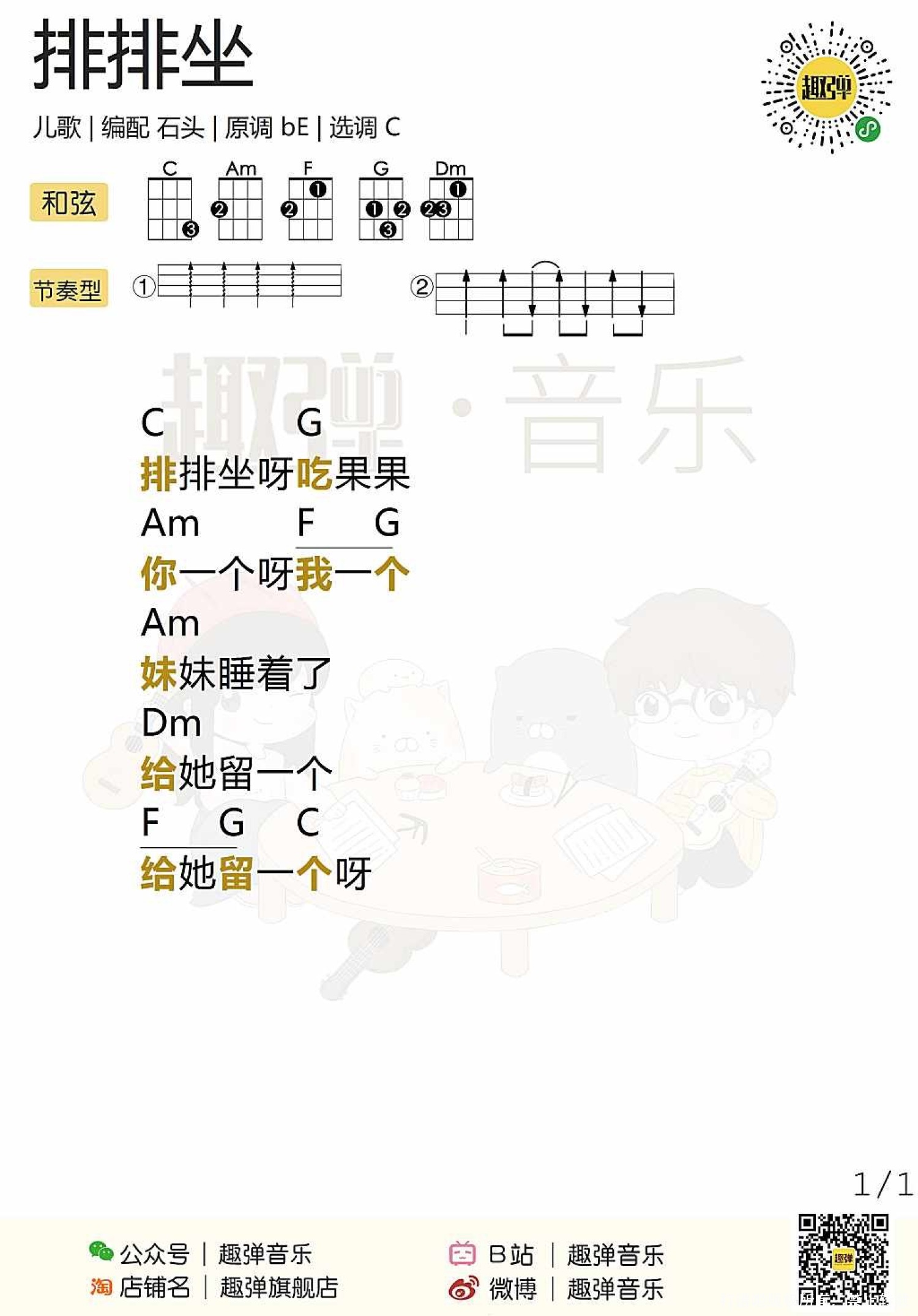 曲谱介绍: 儿歌《排排坐》尤克里里谱,共有1张高清图谱,免翻页排版设计。