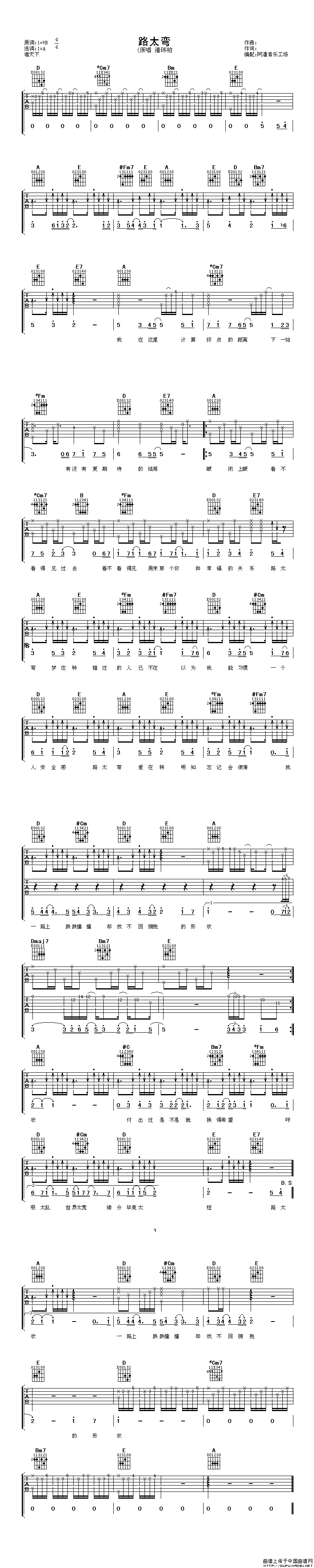 曲谱介绍: 潘玮柏《路太弯》吉他弹唱谱,采用A调指法编配,阿潘音乐工场编配出品,共有1张高清图谱,免翻页排版设计。